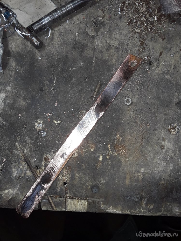 Для того чтобы сделать отрицательный электрод можно взять медную полоску 1см или просто кусок какого то металла но он сильно будет покрывать заготовку грязью так как от электрода отходит окись и прилипает к заготовке. По этому нашел кусок медный он хоть и тоже окисляется, но очень мало и легко стирается с заготовки. Отрезал полосу 15см на 1см и зачистил все болгаркой до блеска отступив от края просверлил отверстие 2мм и закрутил болтик с гайкой крепко чтобы электрод не шевелился иначе может замкнуть. Так же и сделал просто металлическую пластину с черного металла. Далее, для того чтобы работать нужна диэлектрическая емкость на 1л можно стекло или пластик я взял бутылку от удобрений и отрезал горлышко хорошо и промыл мылом. Для крепления я просверлил отверстие в полосе теперь погружаю полосу в емкость делаю разметку и просверливаю отверстие в емкости и закручиваю полосу на болтик внутри емкости как можно крепче для того чтобы электрод находился на одном уровне и не болтался, отрезал немного меньше чем емкость так как нету длиннее. Для того чтобы травление проходило как нужно электрод должен быть по всей длине заготовки по этому емкость и полоса должны быть одинаковые и расстояние от электрода до заготовки было одинаковое так травление будет равномерное. Далее я взял провод и сделал два куска, зачистил концы, поставил крокодильчики от сгоревшей зарядки так как родные жалко они заржавеют и я испорчу новую зарядку. Для второго электрода взял кусок от клапана нержавейку на всякий случай, если не понравится медь попробую клапаном.