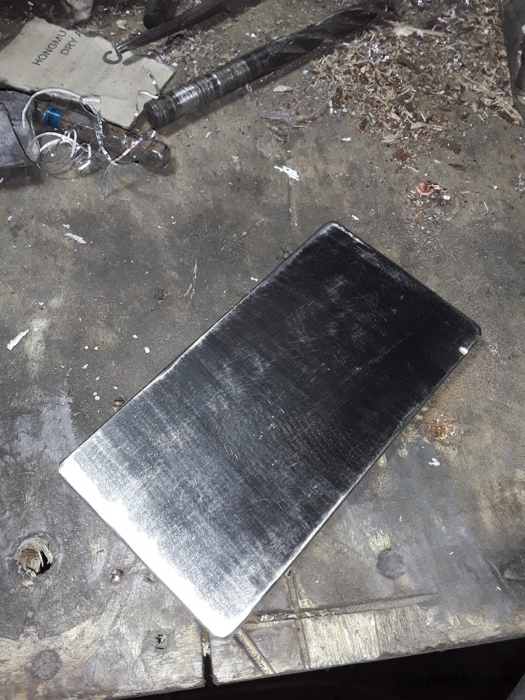 Перед тем как наносить рисунок на метал его предварительно зачищаю болгаркой, а потом на шлиф станке шлифую до блеска. Для опыта как то жалко стало готовый клинок и я решил отрезать прямоугольный кусок металла 1.5 мм и сделать бирку с надписью. Не раз писал и печатал надпись на бумаге и всегда то запачкаю, то порву бумагу, а эта бирка будет вечной. В основном я знаю только 2 способа это просто покрасить заготовку краской или лаком, а потом тонкой иглой выцарапывается рисунок. 2-й способ который гораздо проще это тонкой кистью или остро заточённым карандашом наносится краска или лак уже сразу в виде рисунка. У меня для этих целей используется обычный лак для дерева он плотно сидит на металле и сохнет 10мин. Перед нанесением надписи обезжириваю метал и острым карандашом наношу лаком надпись и даю высохнуть на свежем воздухе.Для работы можно использовать блок питания можно выбирать из того что есть, но чем больше ампер тока, и вольт тем быстрее и глубже получается рисунок. Я попробовал травить от зарядки, но что-то как, то не, так как надо даже на 24 вольта все равно медленно. По совету знакомого использовал акб с полным зарядом просто крокодилами на прямую плюс метал, а минус на медную полосу. В целом на все травление ушло 6минут и то больше разглядывал. Погружал, метал аккуратно на 10 секунд и вытаскивал сразу самое важное это не касаться электрода и не давать нагреваться металлу так лак может отслоиться и рисунок испортится.
