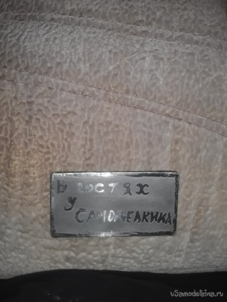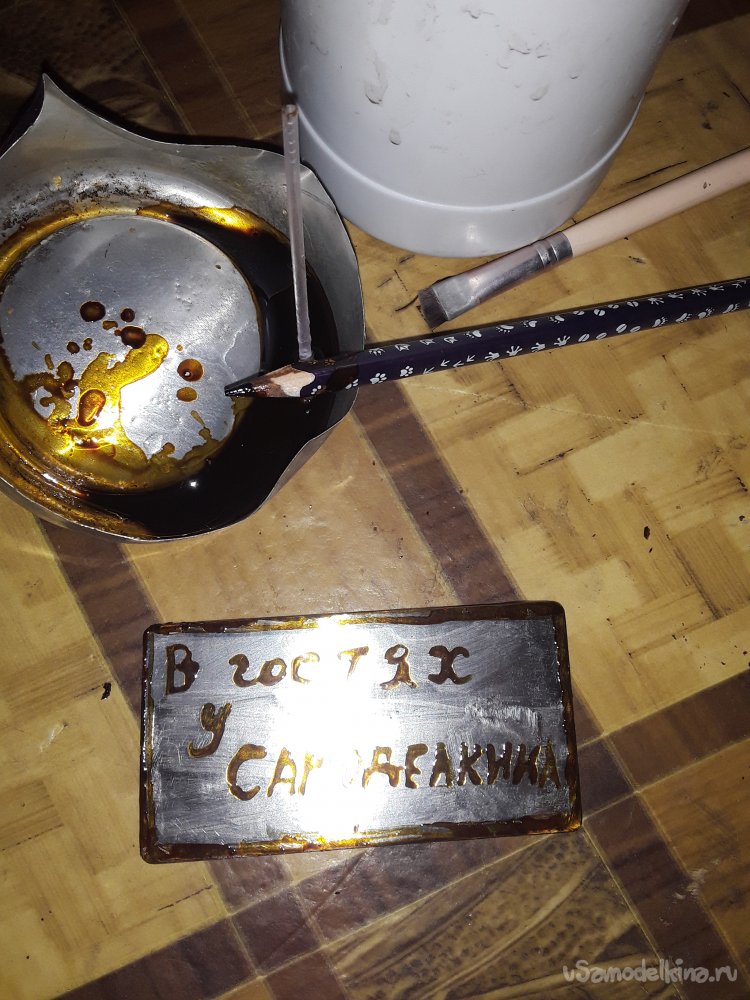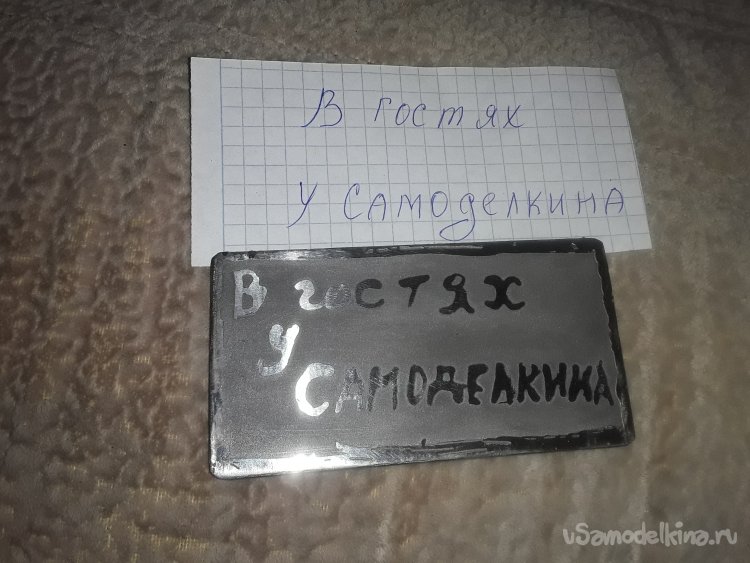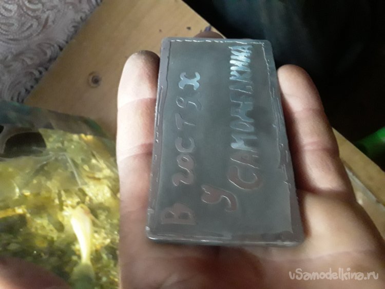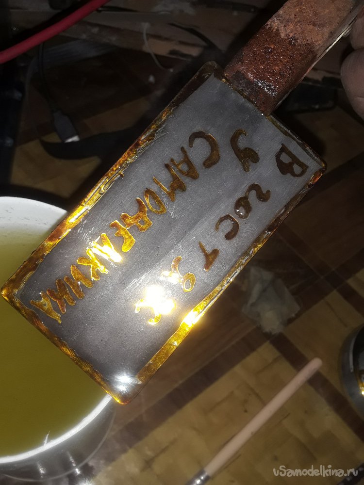В целом глубина травления хорошая буквы чувствуются пальцами и думаю данный метод самое то для травления рисунков на клинке. Пока еще не травил нержавейку думаю эффект будет не худе но наверно медленнее. При травлении от медного электрода на метал прилипает частицы меди, но они ничему не мешают и легко стираются пальцем. Для равномерного травления этот налет нужно стирать и не забывать о том что нельзя сильно нагревать иначе лак отслоиться и раствор проникнет под защитный слой и протравит там где не нужно. Так же попробовал закрасить кусок металла, и нацарапать рисунок так можно нарисовать более детальный рисунок чем когда наносишь карандашом. При работе нужен не малый опыт при нанесении чем точнее и ровнее рисунок тем качественнее работа. У меня опыта мало думаю для первого раза пойдет я даже не думал что все получится. Раньше при травлении очень много уходило времени на ожидание, а сейчас все гораздо быстрее. Ну вот и все что знал, рассказал и показал думаю кому-то пригодится как с нескольких ненужных вещей можно сделать такое нужное приспособление. Еще нужно поэкспериментировать с объёмом чтобы поменьше заготовка нагревалась так как в паре мест все таки лак отошёл да и метал у дна быстрее травится. Ну вот и все пора прощаться кому интересно приходите в гости на мой ютуб канал "В кузнице у Петровича" буду рад всем вы все найдете о чем рассказываю тут. Всем желаю мира и добра в ваш дом и до новых самоделок. Не знал надо или нет, но на всякий случай сфоткал бирку с листком