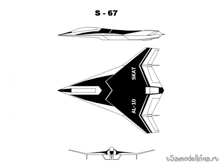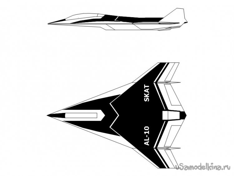 Скат является завершающей точкой в моей теме истребителей выполненных по схеме интегральная бесхвостка с двойной стреловидностью передней кромки крыла. Модель, в общем ,очень простая, имеет много общего с современными российскими БПЛ