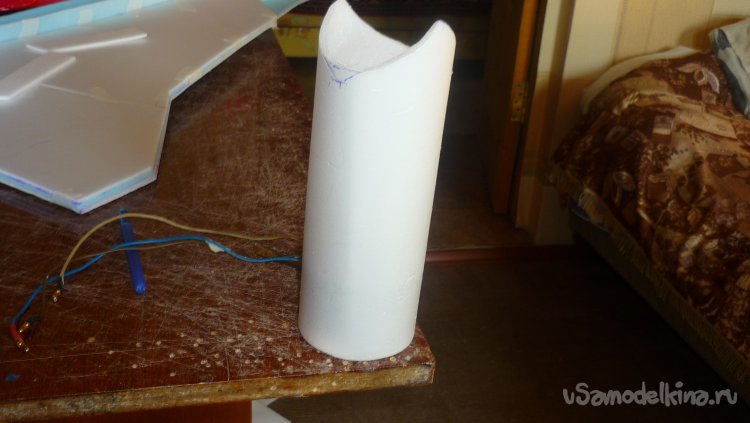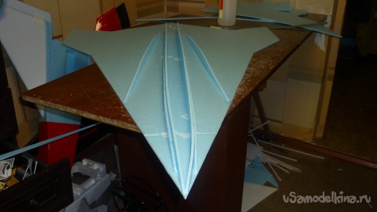 Начинаю выкраивать и подгонять из потолочки внешнюю обшивку модели в носовой части.