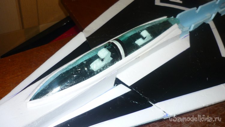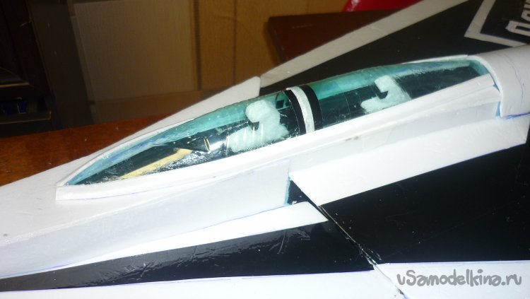 Из пенопласта вырезал фигурки пилотов посадил в кабину, из пластиковой бутылки вырезал остекление кабины, смонтировал.