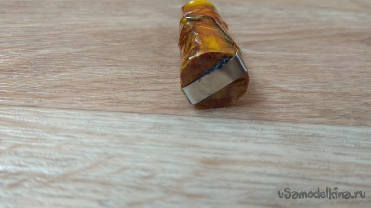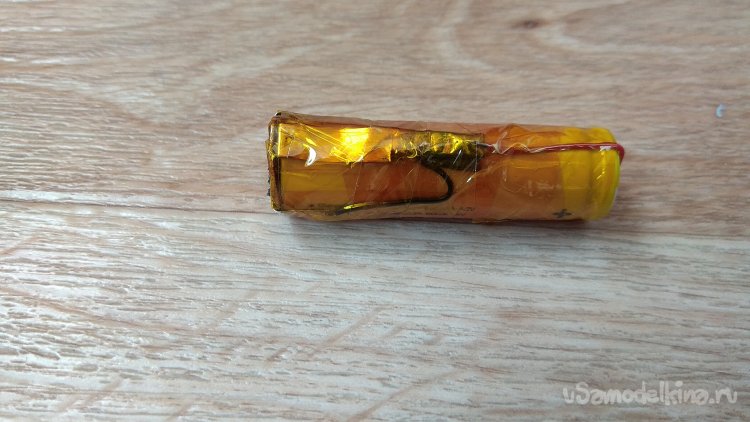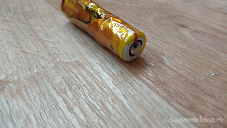 Между минусом аккумулятора и рабочим минусом установлен изолятор из текстолита. В качестве рабочего минуса использована никелевая шинка, приклеил ее на вспененный двусторонний скотч и припаял к P- платы защиты. Затем всю батарейку обмотал каптоновым скотчем.
