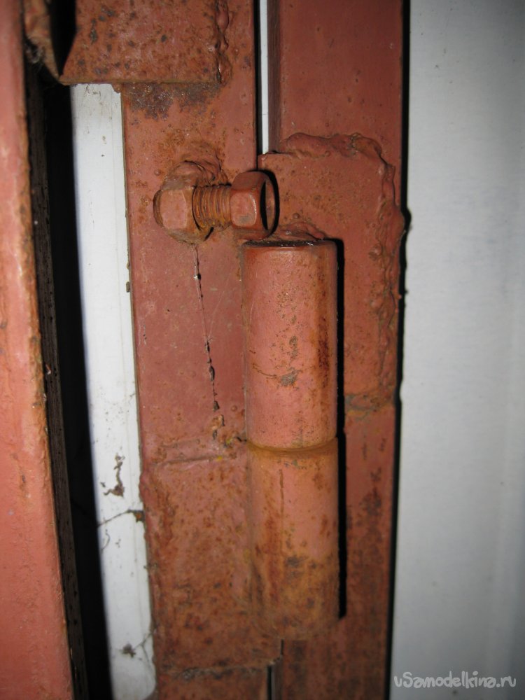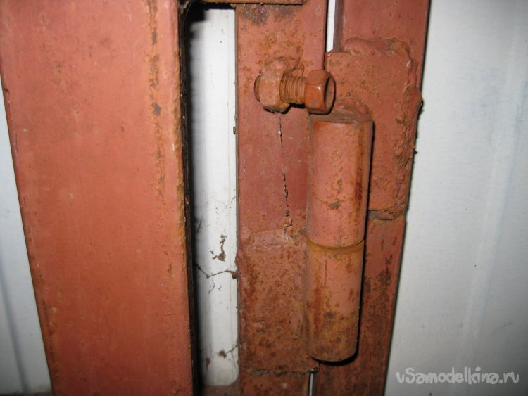 После этого, гайку нужно приварить к косяку чуть выше петли и чуть в стороне от нее (сантиметра на два). Лучше это делать над нижней петлей калики, поскольку до нее невозможно добраться снаружи.