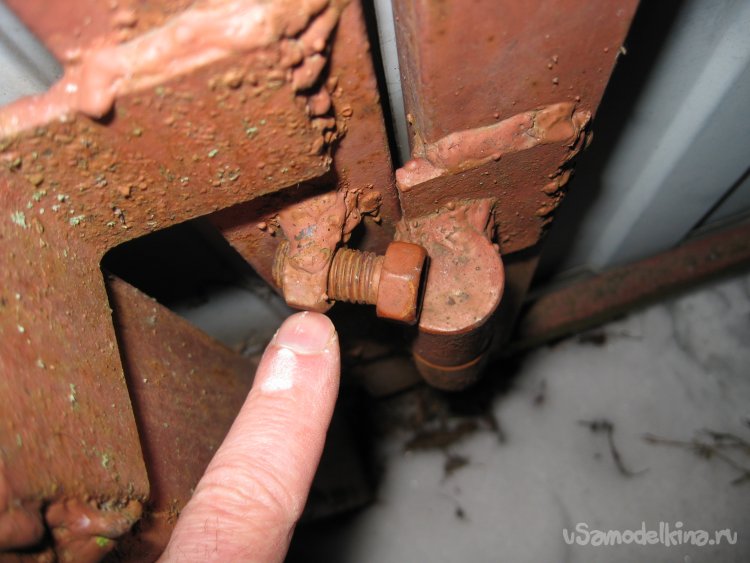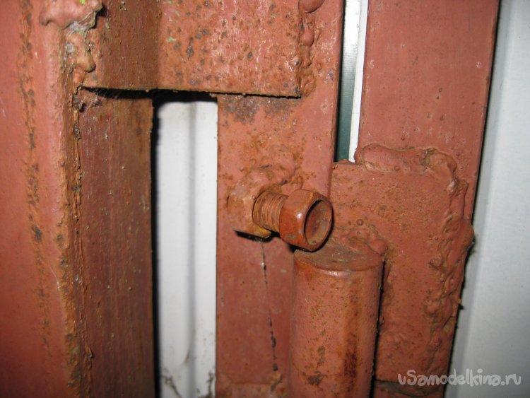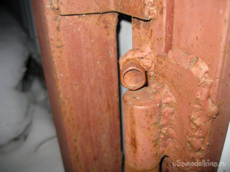 Теперь нашу калитку уже невозможно будет снять с петель, просто поднимая ее вверх (например, поддевая ломиком снаружи). Однако если нам самим понадобиться снять с петель калитку, скажем, для ремонта, то мы сможем легко это сделать, предварительно выкрутив болт из приваренной над петлей гайки.