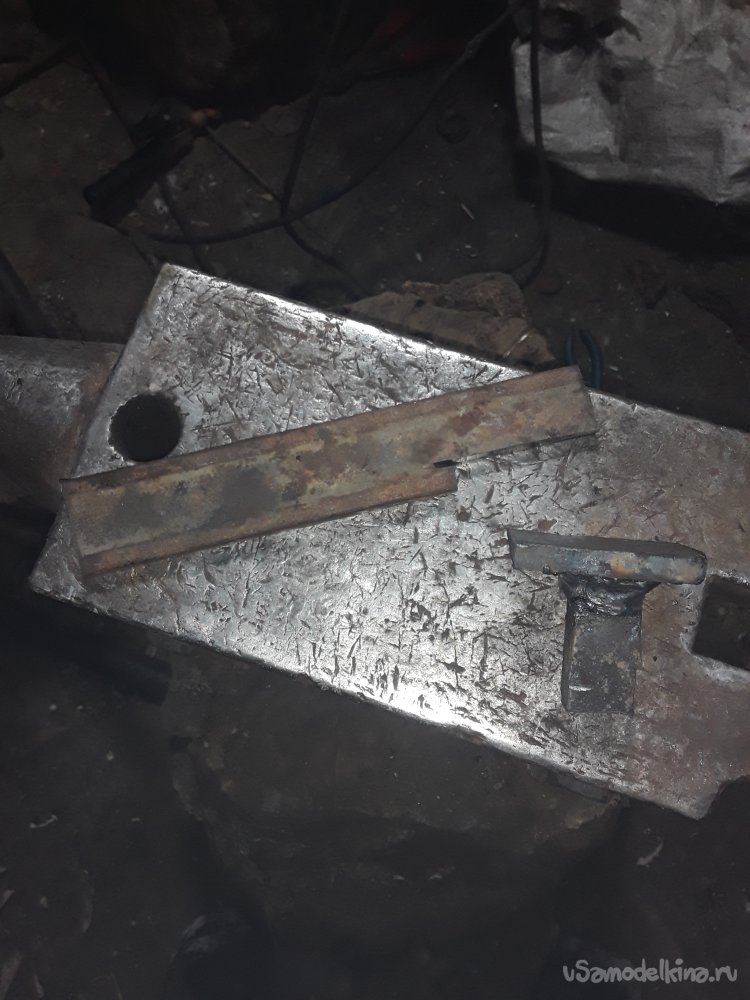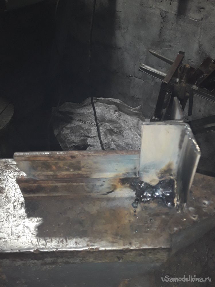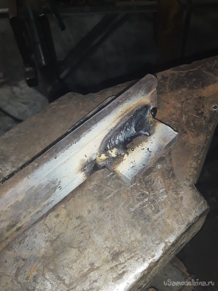 Ну вот все отпилил и приготовил и приступаю к сборке. В начале навариваю на углы квадрата металл и подгоняю под отверстие в наковальне. Теперь привариваю квадрат к куску 5на5см пластине соблюдая прямой угол иначе все будет криво. После сварки пока метал горячий ставлю квадрат в отверстие и молотом нанося удары все что наварил поправляю, так сварочные швы не будут выпирать и подошва будет сидеть ровно и не болтаться. Далее выставляю нижнюю обжимку на свое место прямо на наковальне и аккуратно наживляю. Угольником проверяю чтобы все было установлено ровно и только потом обвариваю сплошным швом как можно прочнее.