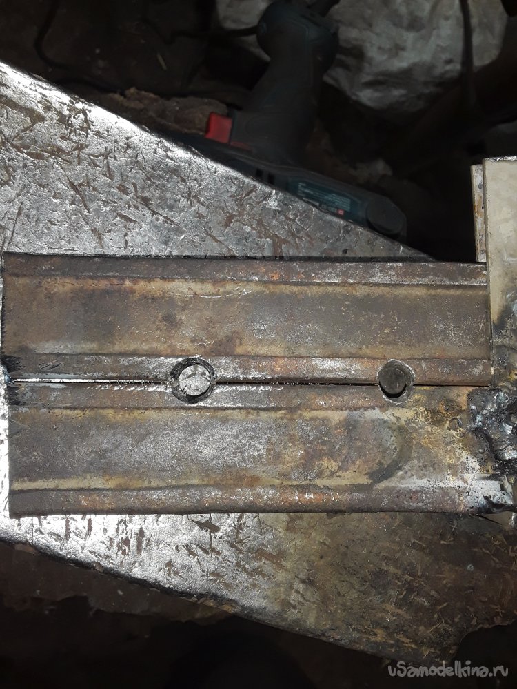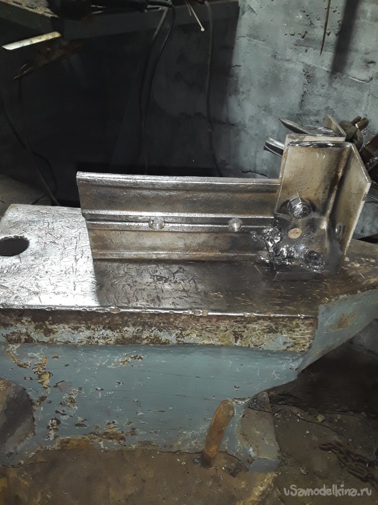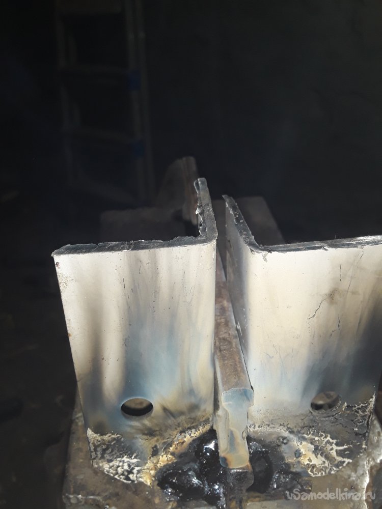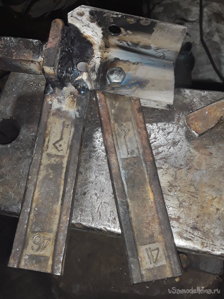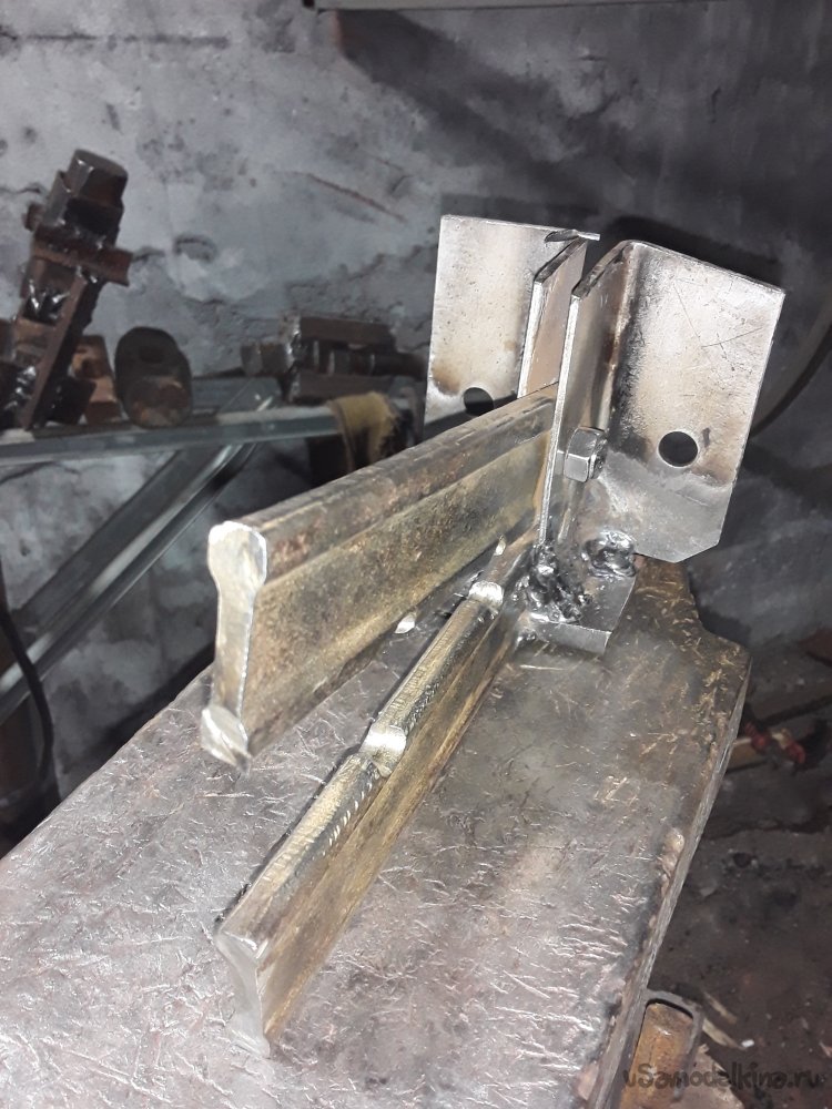 Теперь самое важное в приспособлении это нужно приварить уголки. Для этого можно использовать просто пластины, но думаю уголок будет более прочнее да и в бок при ударе ничего не уйдет в сторону. Для удержания и крепления верхней рабочей части я отрезал 2 куска уголка 40на40мм можно и немного меньше главное толщина чем больше тем лучше. Устанавливаю один отрезок с края прямо на нижней части и немного наживляю по краям потом устанавливаю верхнюю рабочую часть и 2‑й уголок параллельно второму так, чтобы все было плотно и так же наживляю. После всех проверок на ровность и зазор не снимая верх все основательно привариваю к боку и низу башмака. Метал немного повело и зажало верх, но это не страшно думаю разработается если что немного прошлифую лишнего так как верх должен ходить свободно и не закусываться.