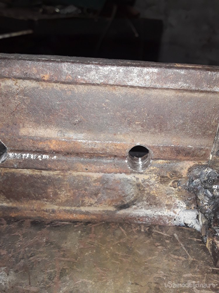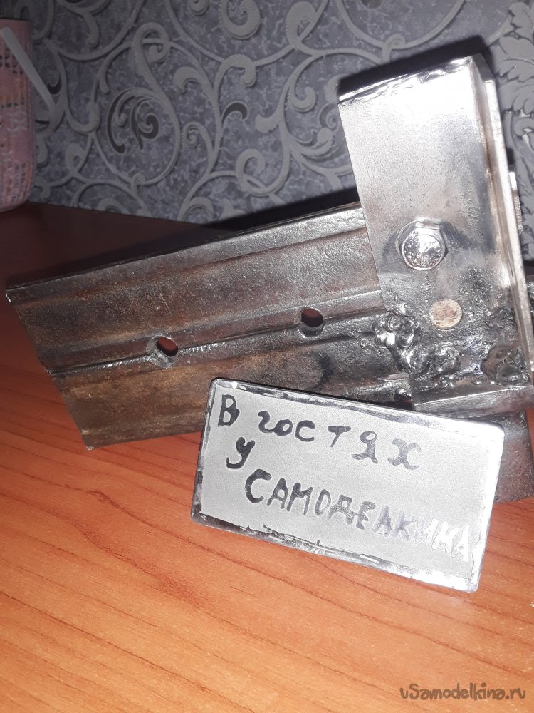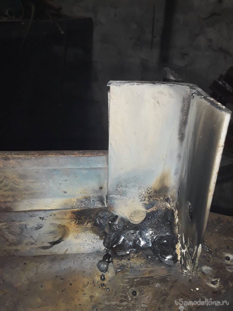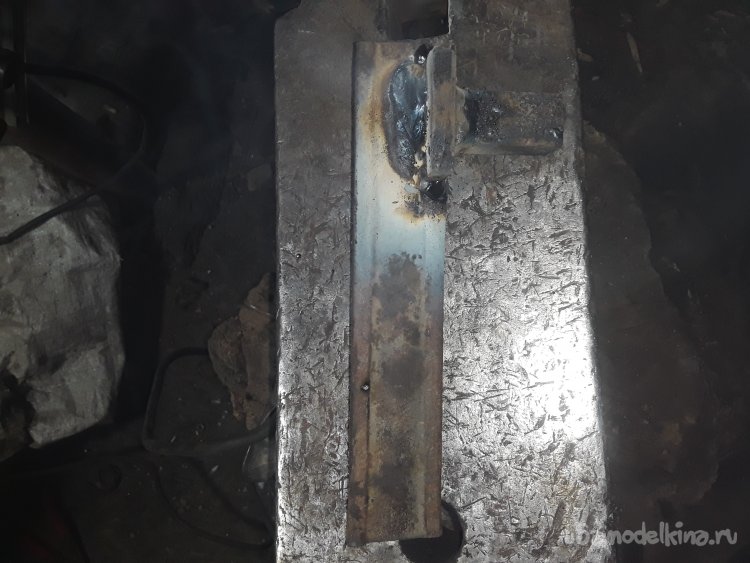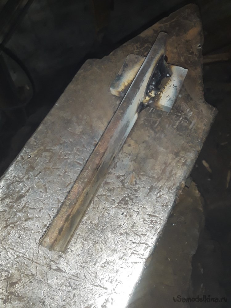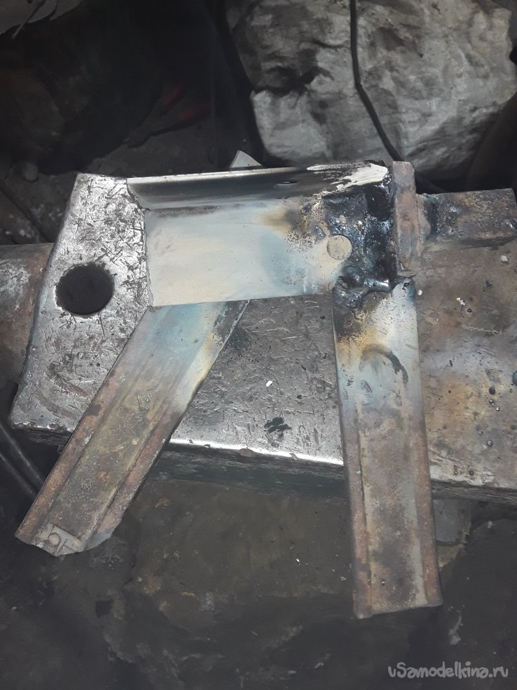 Теперь самое важное в приспособлении это нужно приварить уголки. Для этого можно использовать просто пластины, но думаю уголок будет более прочнее да и в бок при ударе ничего не уйдет в сторону. Для удержания и крепления верхней рабочей части я отрезал 2 куска уголка 40на40мм можно и немного меньше главное толщина чем больше тем лучше. Устанавливаю один отрезок с края прямо на нижней части и немного наживляю по краям потом устанавливаю верхнюю рабочую часть и 2‑й уголок параллельно второму так, чтобы все было плотно и так же наживляю. После всех проверок на ровность и зазор не снимая верх все основательно привариваю к боку и низу башмака. Метал немного повело и зажало верх, но это не страшно думаю разработается если что немного прошлифую лишнего так как верх должен ходить свободно и не закусываться.