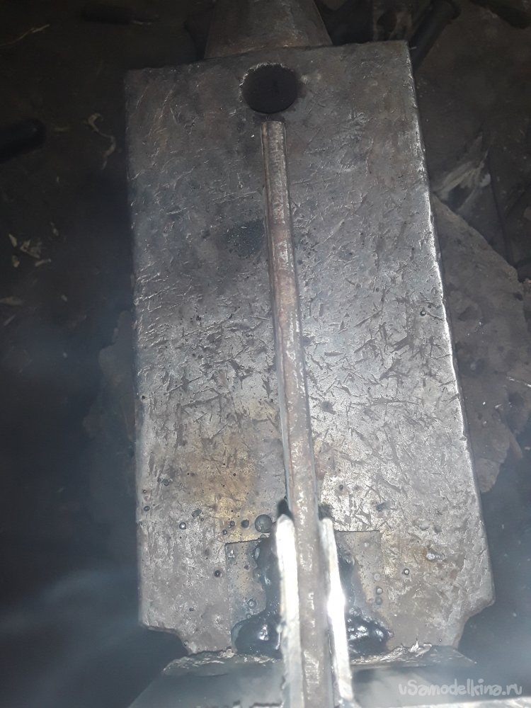 Ну вот и все устройство готово к работе осталось придать немного вида. Отбиваю весь шлак и дрелью с щеткой по металлу обрабатываю всю поверхность только там где подлезу от ржавчины и окалины. После щетки метал выглядит блестяще, как всегда, красить не вижу смысла рабочий инструмент, главное он должен исполнять свое предназначения. Для сборки у меня ушло примерно 2 часа к сожалению уже поздно да и горн уже прогорел завтра буду проверять. Но думаю без сомнения все получилось как надо и работать будет без проблем. Главное при сборке использовать хороший толстый материал так как это ударный инструмент и он должен быть безопасным. Таким приспособлением я буду работать для формировки пережатия на окончаниях прута и пик так же для придания фактуры битого прута.