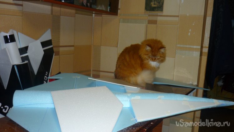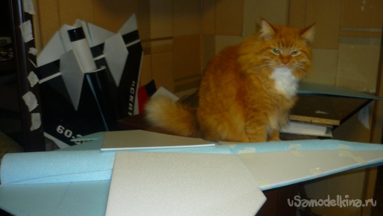 Генеральный директор – Пушок, контролирует точность подгонки заготовок внешней обшивки средней секции модели.