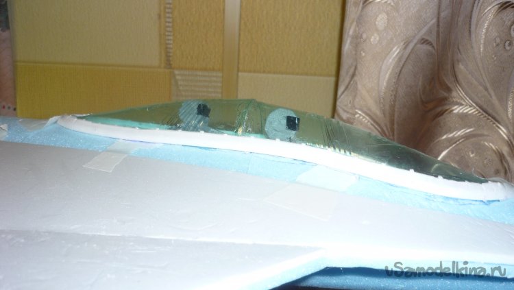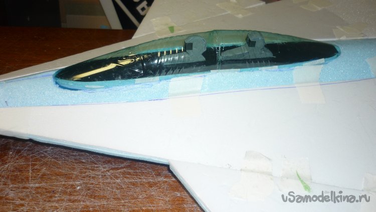В фюзеляже делается вырез по размеру заготовки. Из подложки вырезается две заготовки по форме этого выреза и склеиваются в два слоя, обтягивается чёрным скотчем и на неё приклеиваются фигурки пилотов, вырезанных из серого утеплителя.