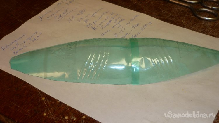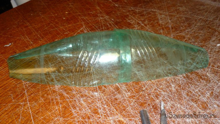 Далее решил заняться изготовлением кабины. Вначале хотел вырезать из пенопласта и обтянуть чёрным скотчем, но мне показалось , что такая кабина будет смотреться очень грубо на такой модели. Решил сделать «остекление» кабины из пластиковой бутылки. Рассказываю подробней.