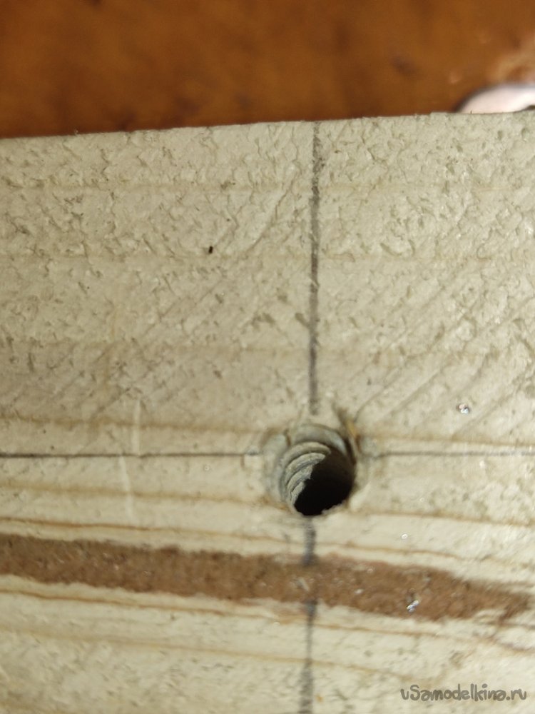 К делу : отступаем от её края 20 мм. Ставим метку, по угольнику проводим линию параллельную ширине (10 мм), далее, отступаем ещё 4 мм проводим такую же линию. У нас получился некого рода прямоугольник. В нём мы проводим диагонали, именно их пересечение будет нашей заветной точкой. Такую же операцию проделываем с противоположного края. Полученные точки накалываем шилом и сверлим отверстия 3-мм сверлом.