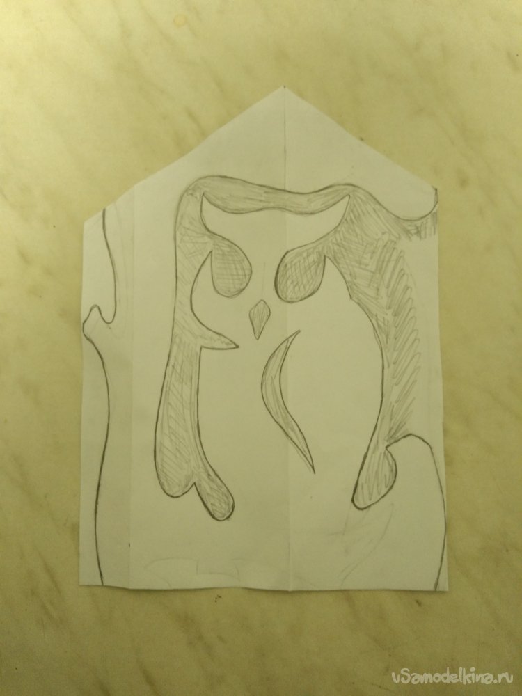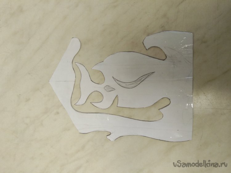 Для начала мною был изготовлен шаблон из бумаги. Когда принимаюсь за какое-то изделие впервые, я всегда делаю трафарет, чтобы в случае необходимости была возможность повторить это-же изделие с большей схожестью, удобством и скоростью, что очень немаловажно. Нарисовав на листе формата А4 рисунок я, для большей долговечности шаблона обклеил его прозрачным скотчем с двух сторон. Так он будет защищен от влаги и не так быстро растрепается от частого применения. Затем обрезал все не нужное. Вот какой получился итог подготовительной работы по трафарету: