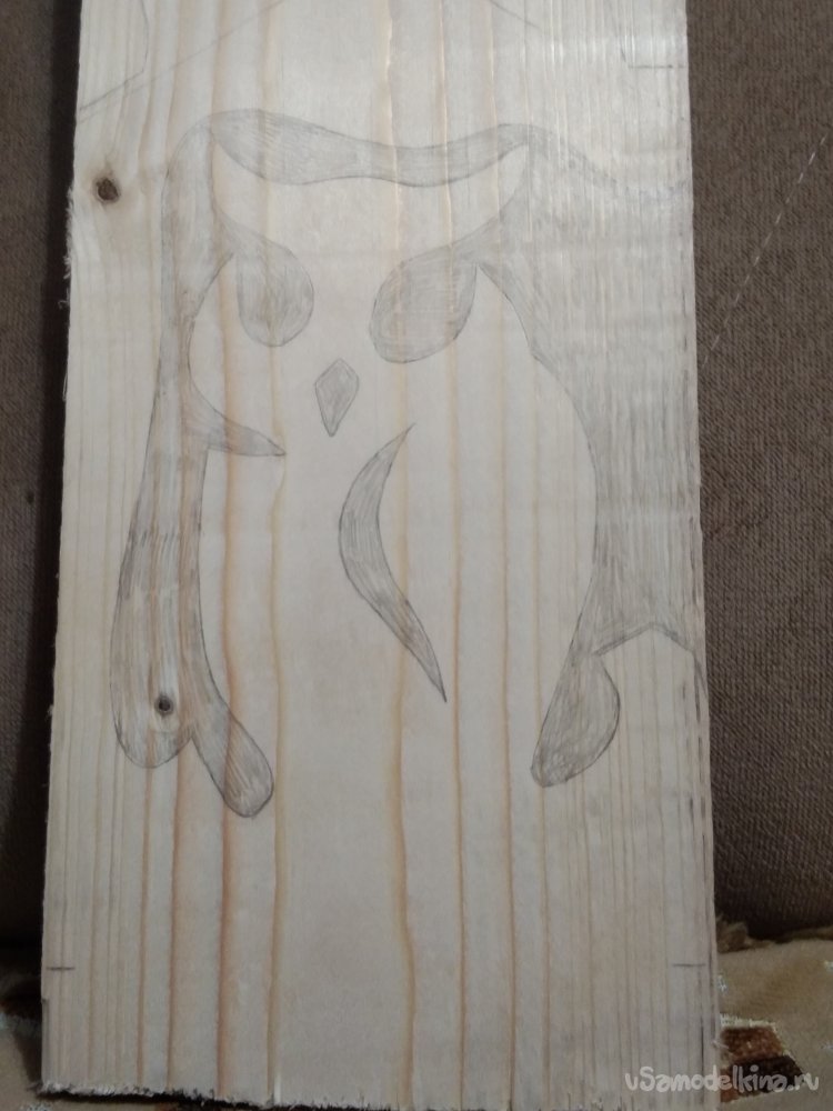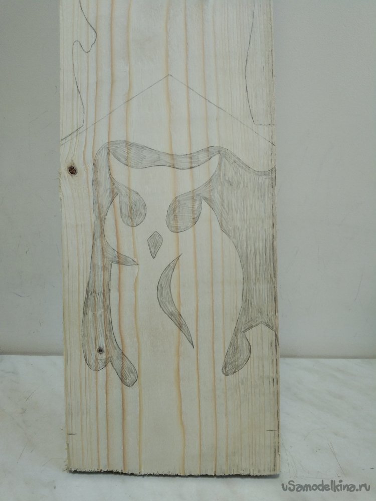 Далее взял сосновую доску и пропустил ее через рейсмусовый станок. С таким материалом намного приятнее и удобнее работать, не говоря уже о том, что карандашные линии на гладкую заготовку наносятся не в пример легче и лучше видны на ней. Затем трафарет зафиксировал на доске с помощью канцелярских цветных кнопок и обвел шаблон по контуру. Так как в наличии у меня не оказалось достаточно широкой доски, чтобы рисунок полностью на ней уместился, мне пришлось часть рисунка наносить на другую заготовку, а в последствии крепить части друг к другу с помощью столярного клея, для большей прочности прикрутив еще и саморезами.