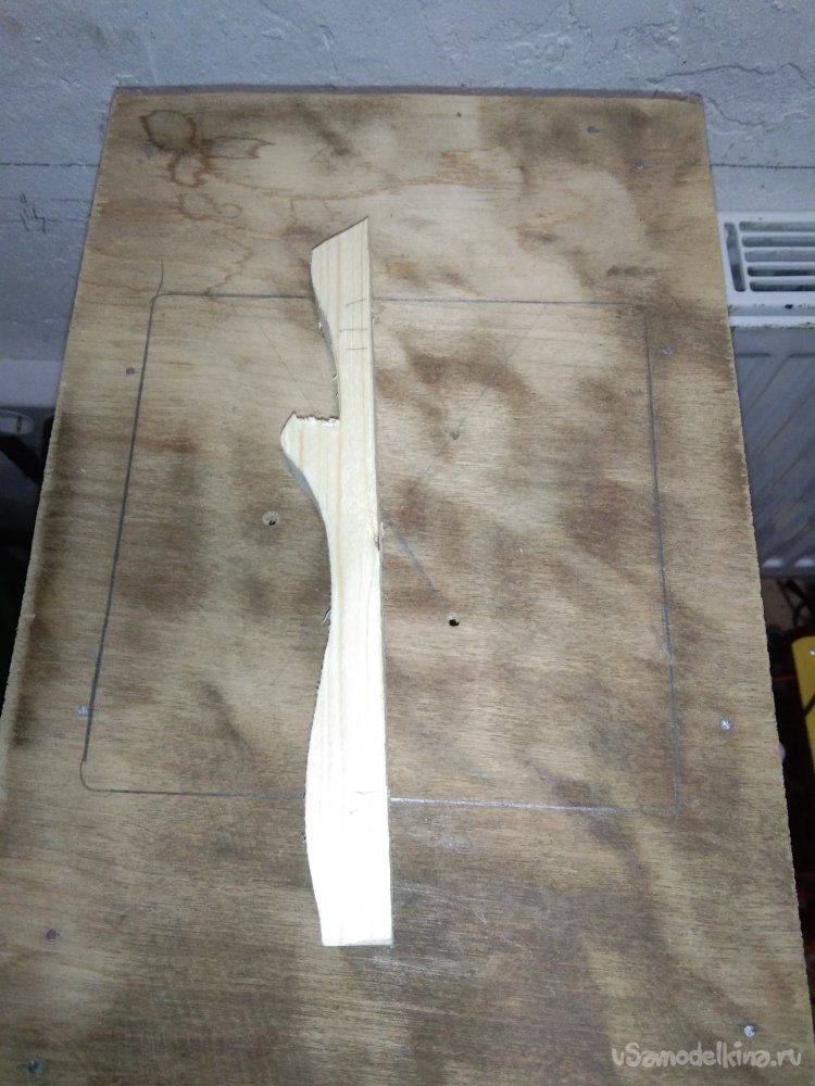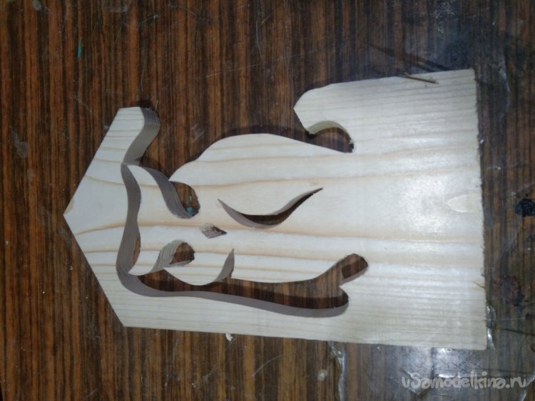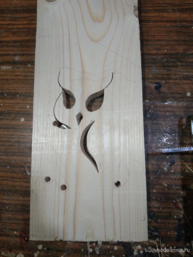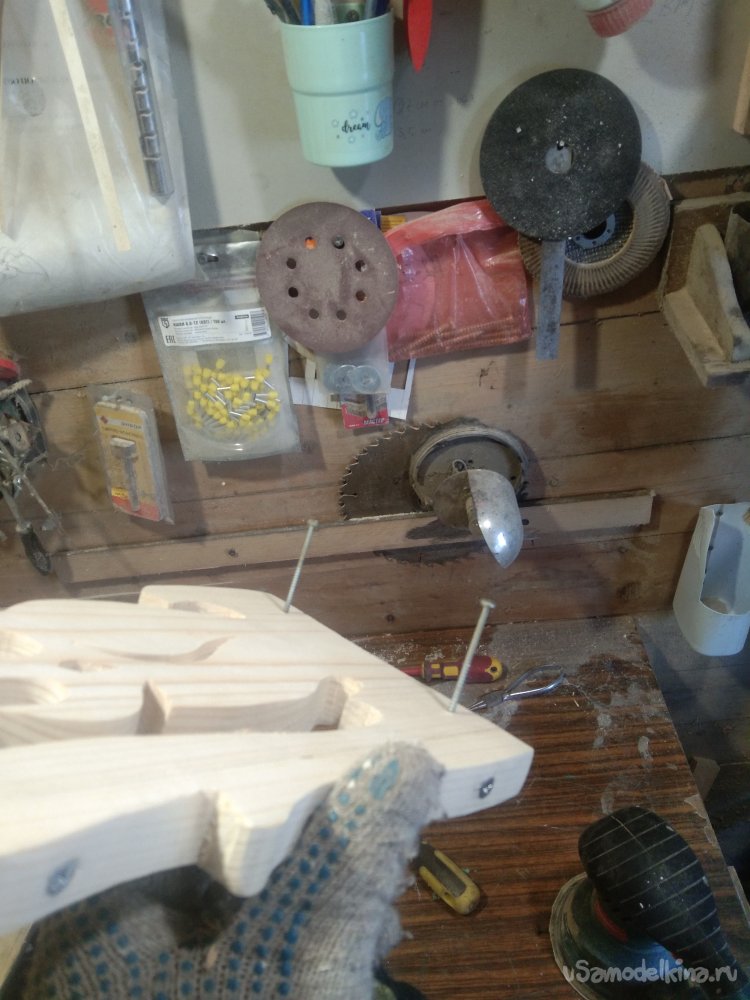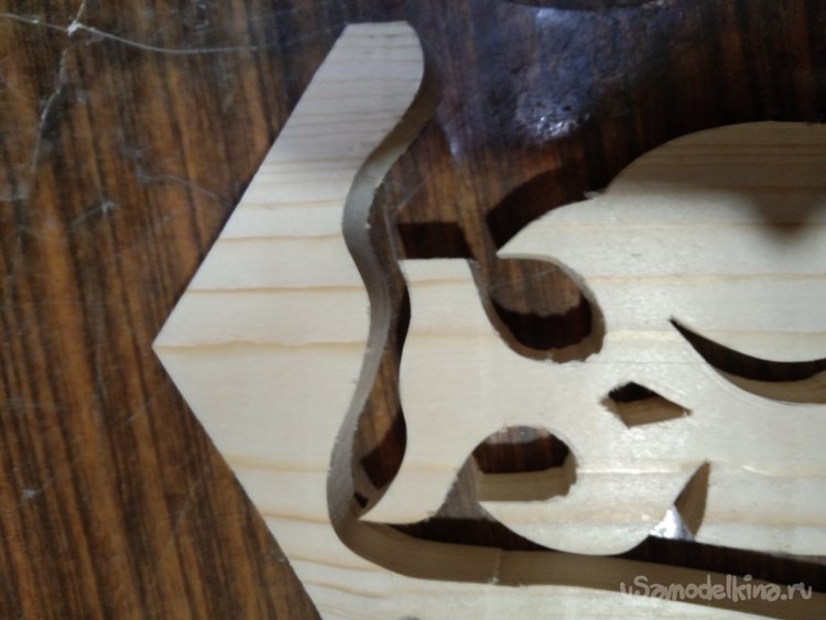 Далее приступаю к выпиливанию заготовок. Это боковые стенки будущей кормушки. Таких деталей необходимо две штуки. Электролобзиком с полотном по фигурному резу начинаю аккуратно выпиливать, так, чтобы не сломать заготовку. Там, где было неудобно пилить, шуруповертом высверлил отверстия под полотно. И так, осторожно по контуру выпилил несколько заготовок. Одна во время работ ушла в брак. Сломалась на несколько частей, что было очень досадно. Затем выпилил части заготовок, которые из-за маленького размера основной доски пришлось перенести на другую. Нанес клей на края заготовок и прижал их друг к другу саморезами, на подобие струбцин. После того, как детали крепко приклеились начал дальнейшую обработку этих заготовок-стенок. А именно шлифовка и выравнивание спилов. Для этой цели у меня имеется гравировальная машинка. Установил насадку с наждачной бумагой и постепенно убрал все неровности. Далее прошелся наждачкой вручную.
