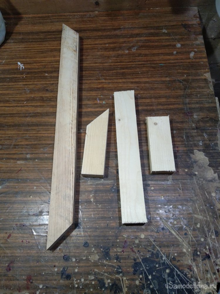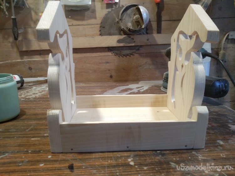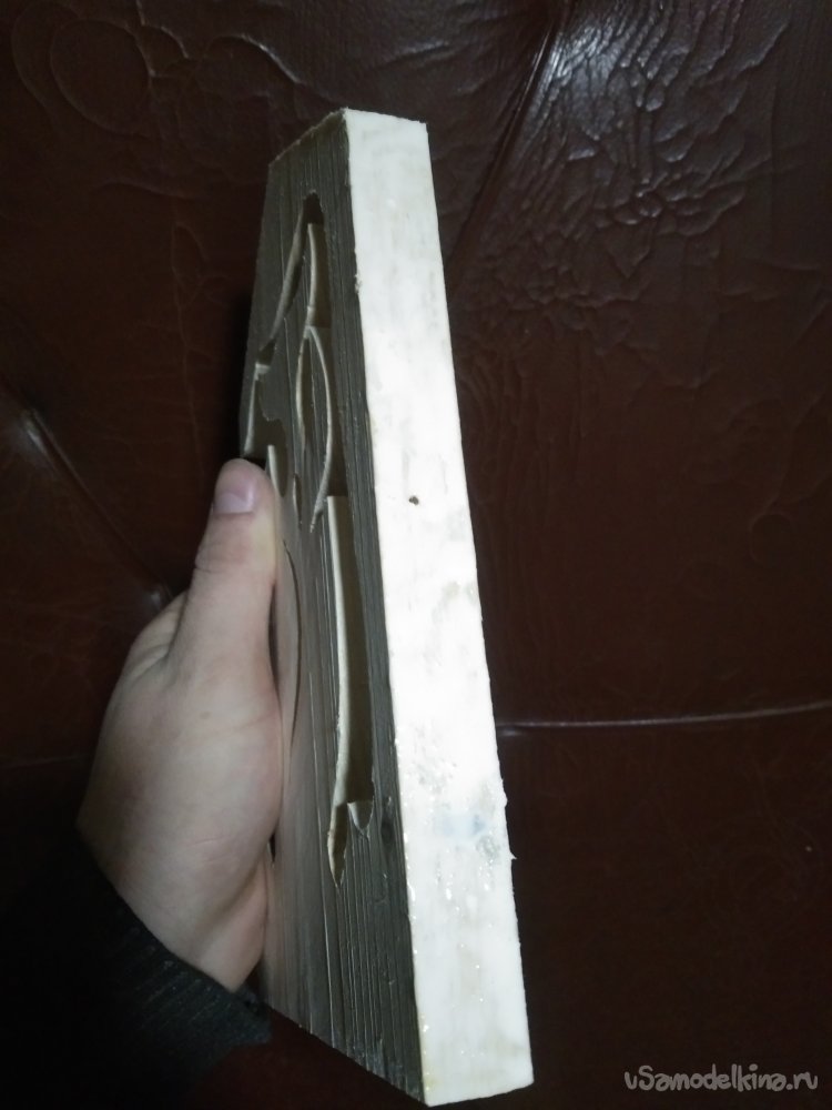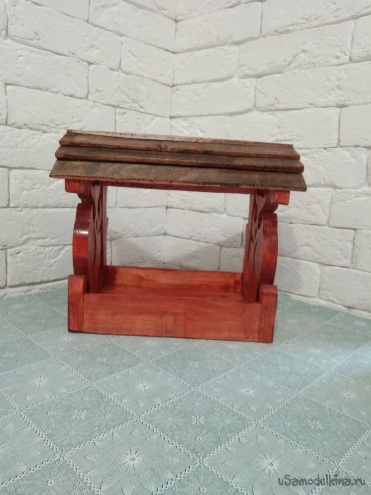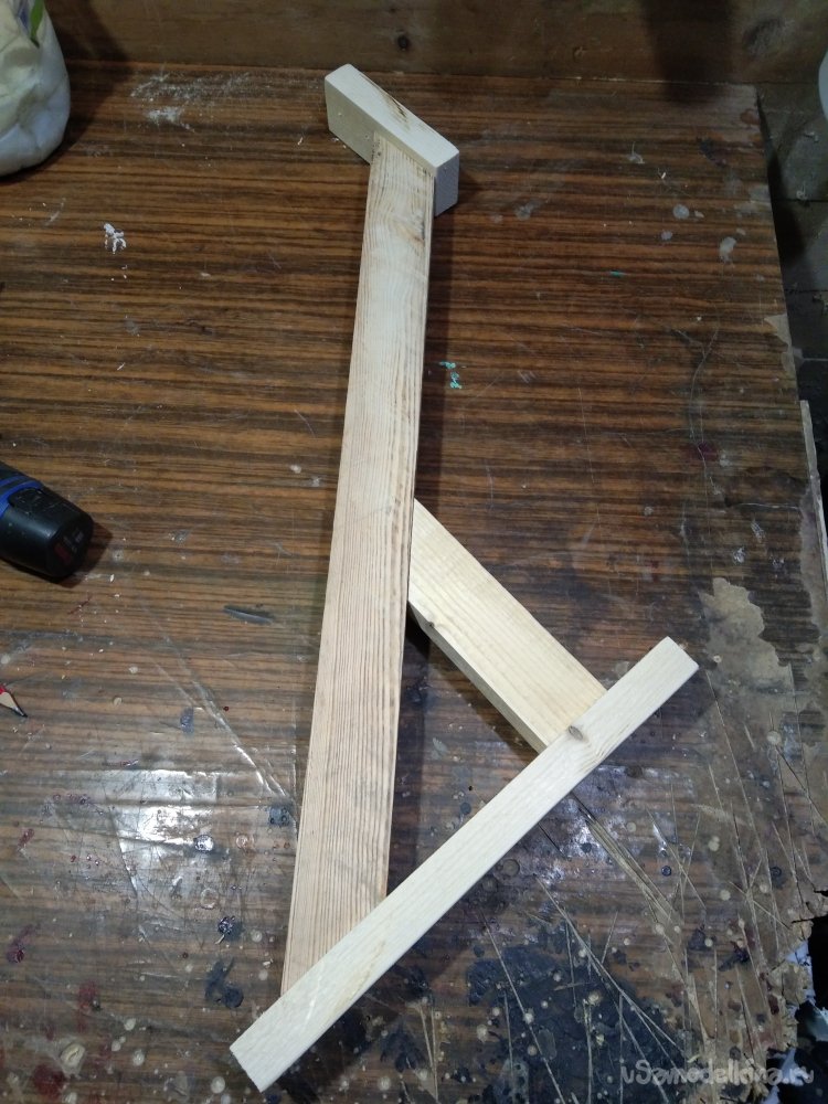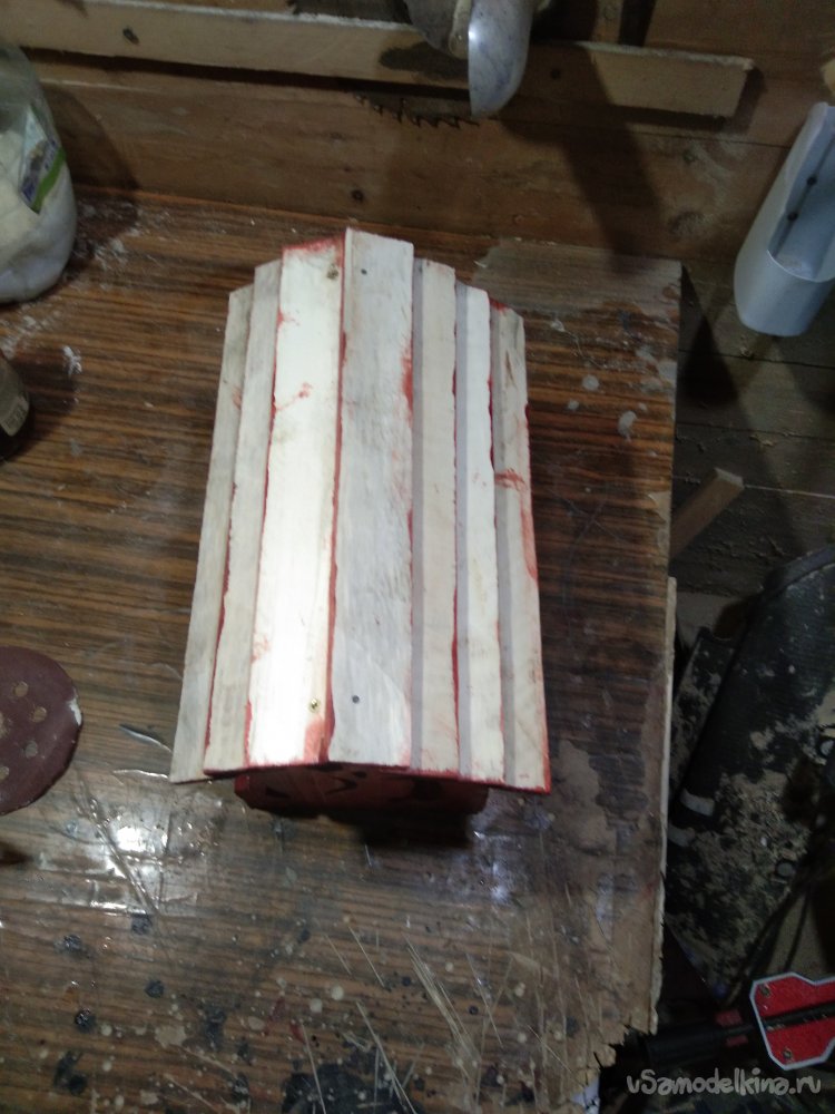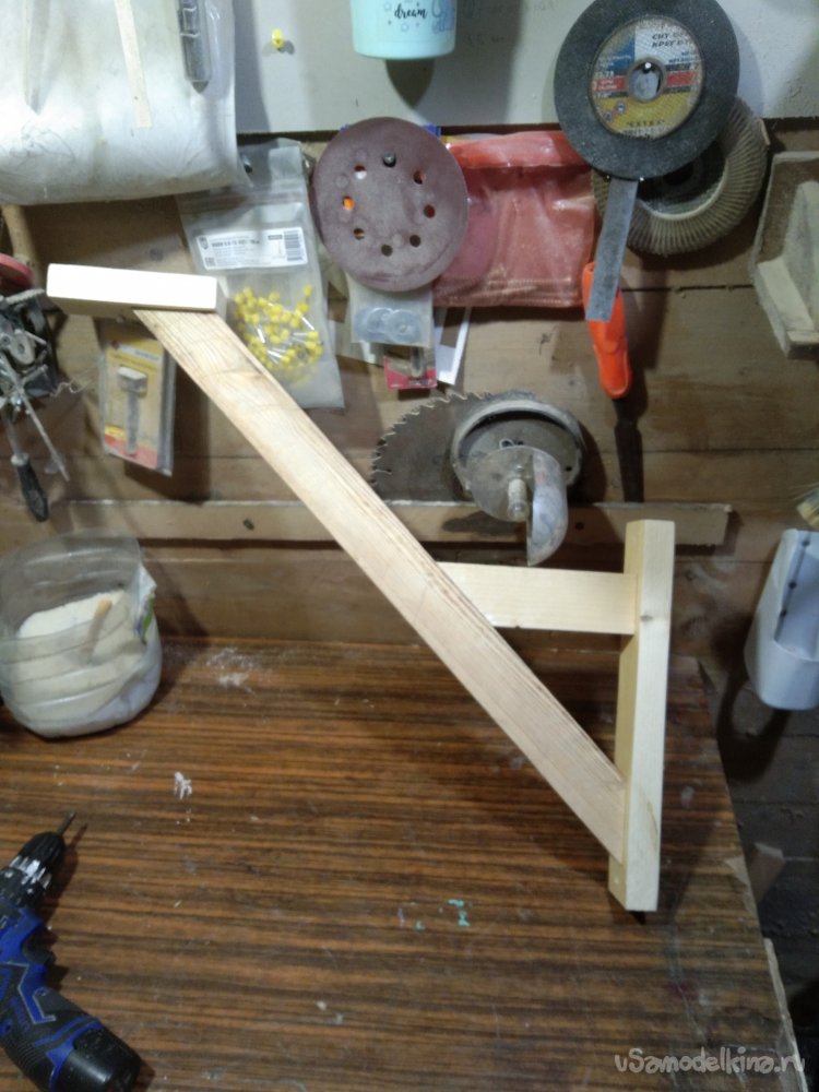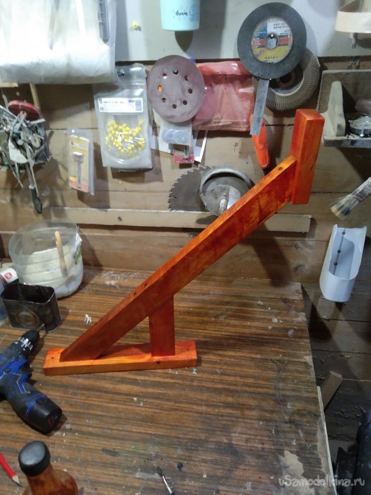 Последний этап - изготовление подставки для изделия. Для этого я использовал оставшиеся от других проектов обрезки досок. Основной упор отпилил с двух сторон под углом в 45 градусов. К нему уже крепил остальные части опоры. Получившуюся конструкция покрыл лаком. Вот как все выглядит в собранном варианте:
