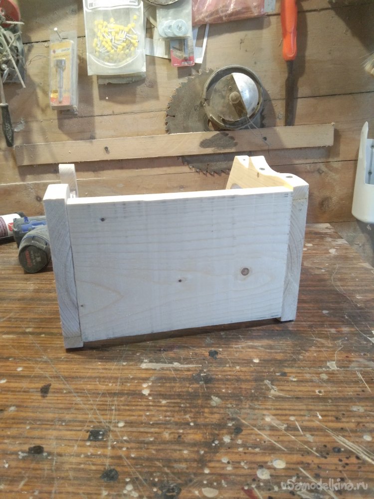 Торцовочной пилой отпилил еще одну заготовку для дна кормушки. В боковых стенках высверлил отверстия под саморезы, чтобы во время закручивания оных не расколоть заготовки. Устанавливаю дно кормушки таким образом, чтобы были небольшие расстояния перед боковинами. Они необходимы чтобы установить боковые ограничители, чтобы не высыпался корм. Все прочно закрепляю на саморезы и клей. Напилил две заготовки под ограничители и несколько, заранее, для того чтобы накрыть крышу. На подобие черепицы, только во всю длину. Так же нанес клей на склеиваемые поверхности и прибил гвоздиками. Саморезами не стал, так как толщина не очень большая. Данные планки были взяты с фруктовых ящиков, которые я набрал в большом количестве на фруктовом рынке. Очень хороший и доступный материал для изготовления разнообразных поделок!