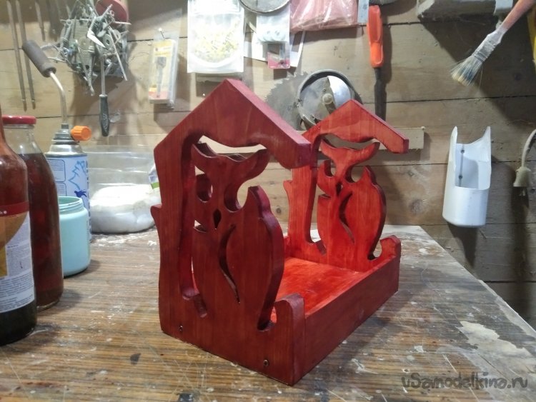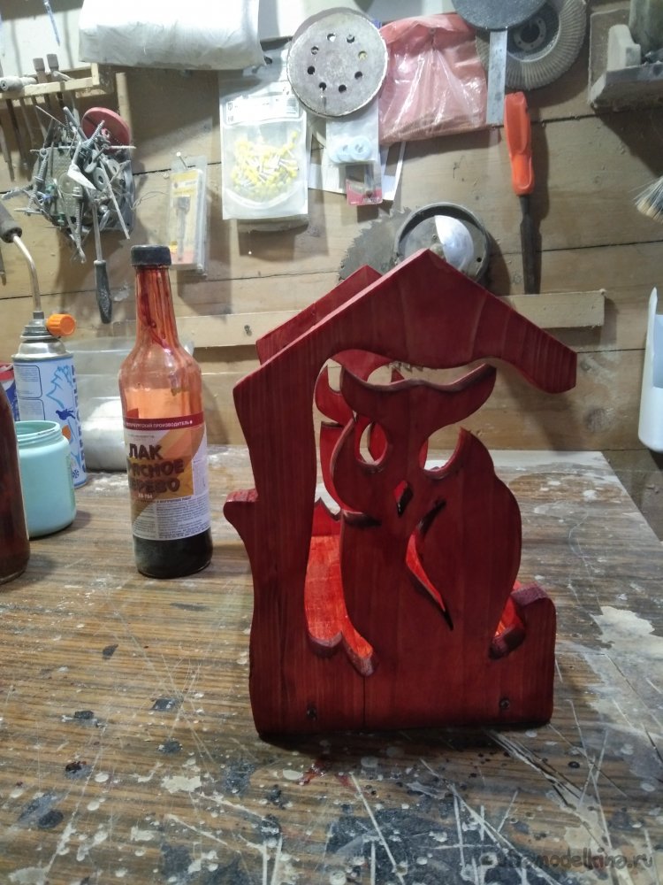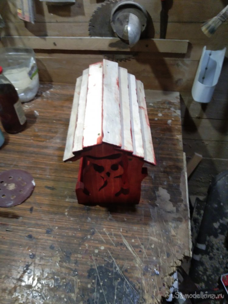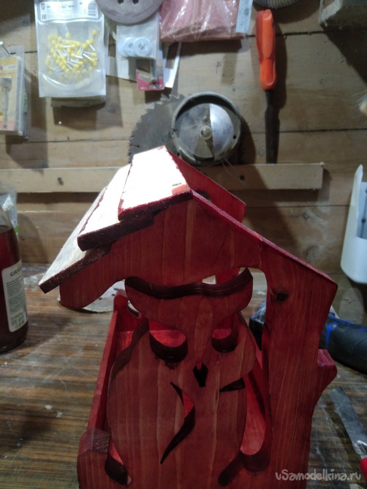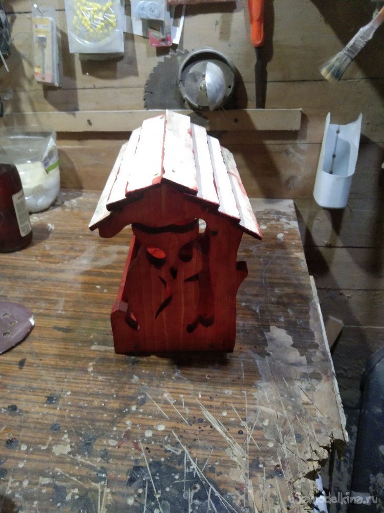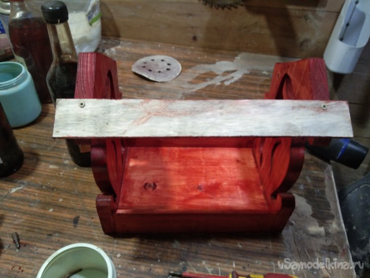 Так как эту кормушку делал по просьбе дочурки, то и цвет ее она выбирала сама. Выбрала красный. Поэтому я нанес на кормушку лак "красное дерево". Особое внимание заострил на прокрашивании внутренних вырезов. Не очень удобная работенка. Вот как это выглядит после нанесения лака.