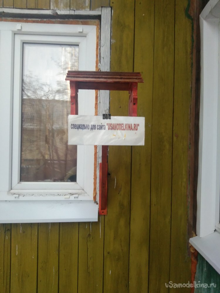 Далее прикрепил кормушку к опоре саморезами и закрепил на стене дома на улице. Прямо перед окнами, чтобы ребенок мог смотреть на трапезничающих пернатых. Да и подсыпать корм так удобнее. Открыл окно и насыпал чего-нибудь по мере опустошения кормушки.