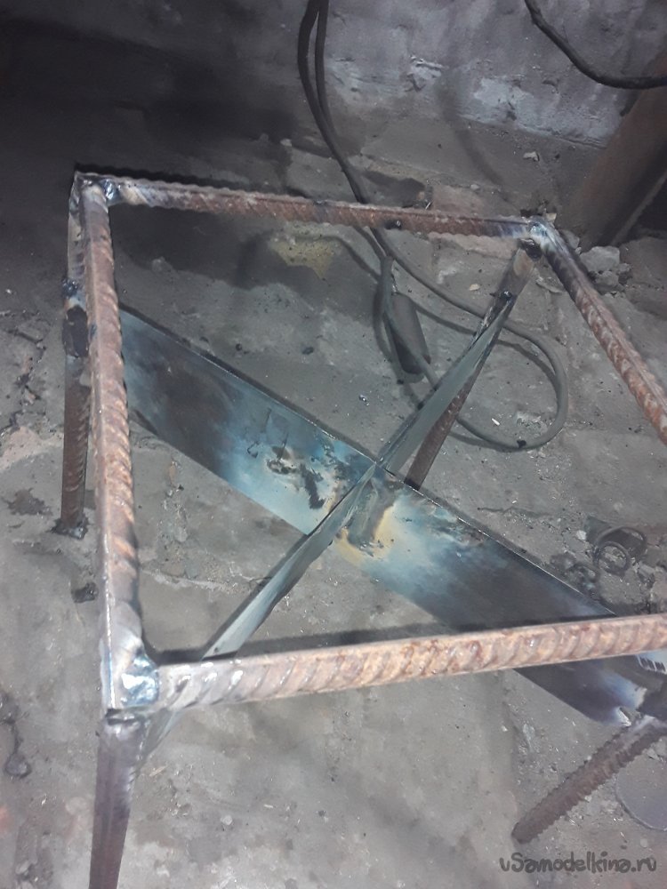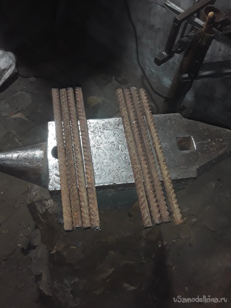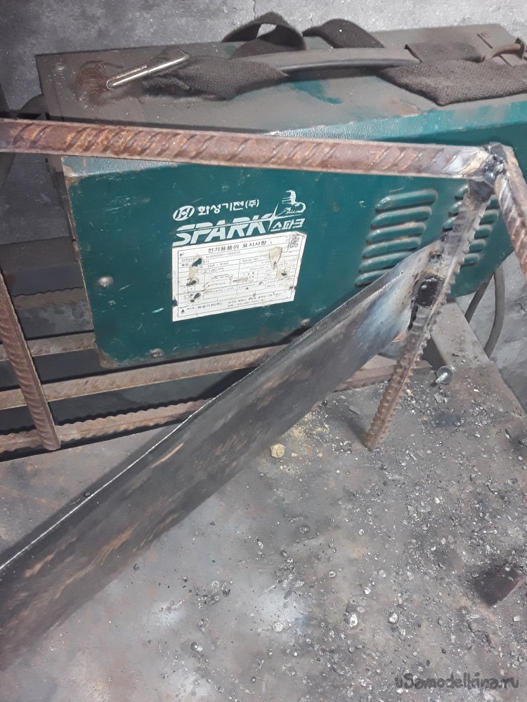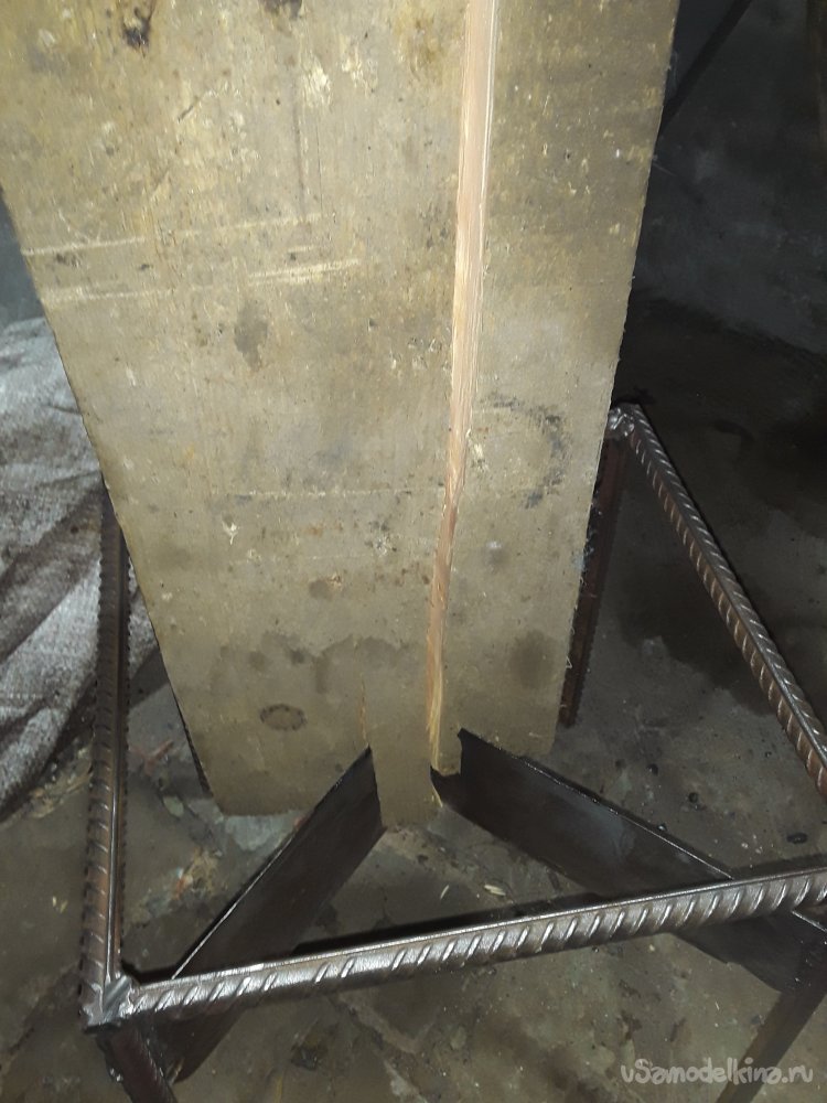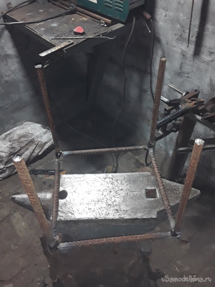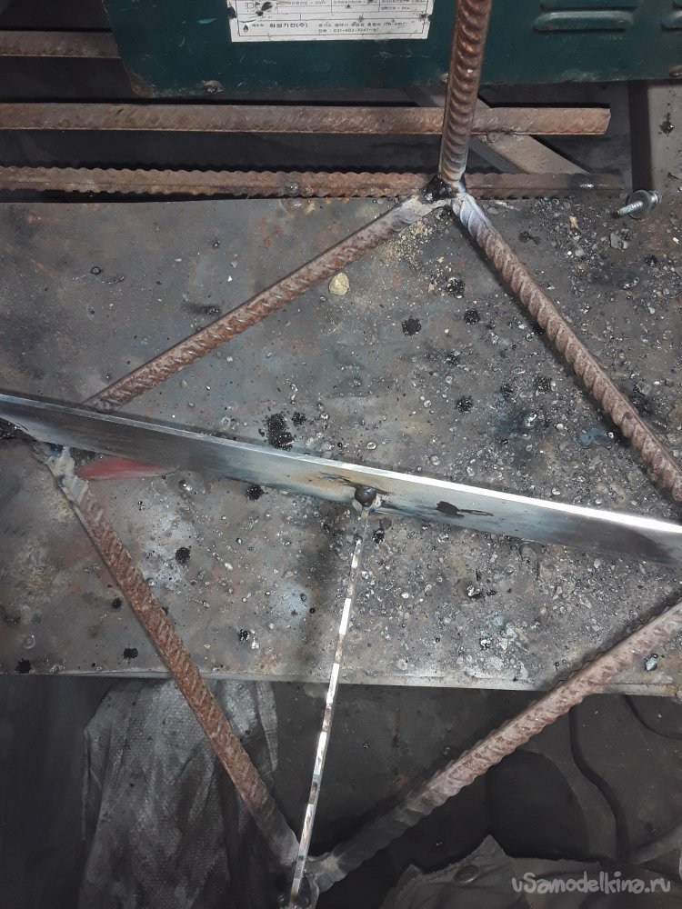 После проверки правильности углов привариваю все окончательно. Далее отбиваю весь шлак и болгаркой шлифую все швы и все места где буду приваривать ножки зачищаю и выравниваю чтобы ничего не мешало. Для ножек отрезаю по 26см 4 куска арматуры также соблюдая все углы с уголком наживляю ножки попарно. Так как у меня в кузнице пол бетонный на окончания ножки приваривать ничего не буду, так есть неровности пола и конструкция будет не устойчивой да и будет греметь при ударах. После выравнивания углов привариваю все так, чтобы все было безопасно и ничего не отвалилось. При сварке одну ножку повело и она ушла в сторону на 3мм для того чтобы выровнять в месте сварки прогреваю электродом до красна и подгибаю как нужно и пока остывало держал руками. Ну вот основной каркас готов осталось самое главное это приварить рубящее лезвие.