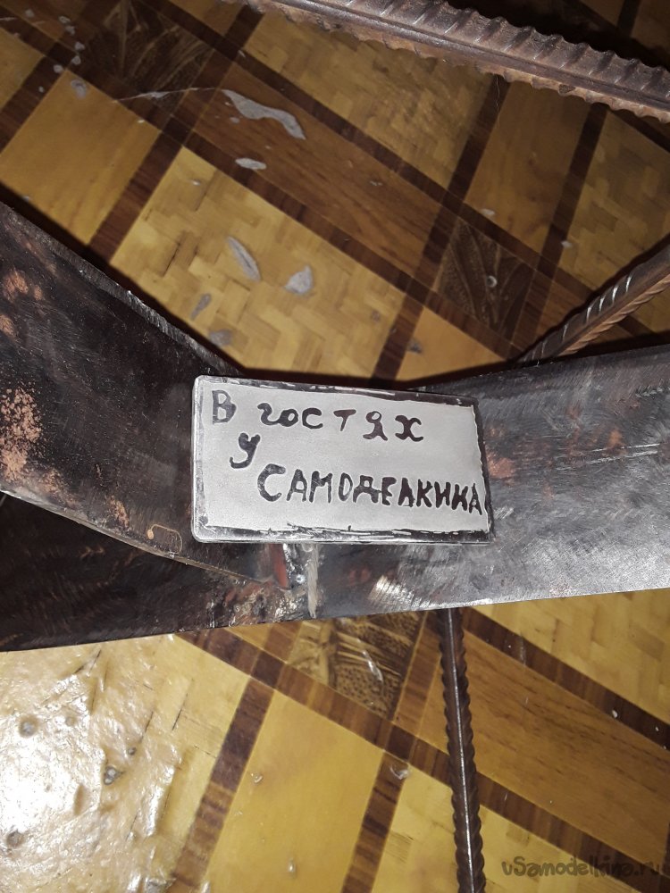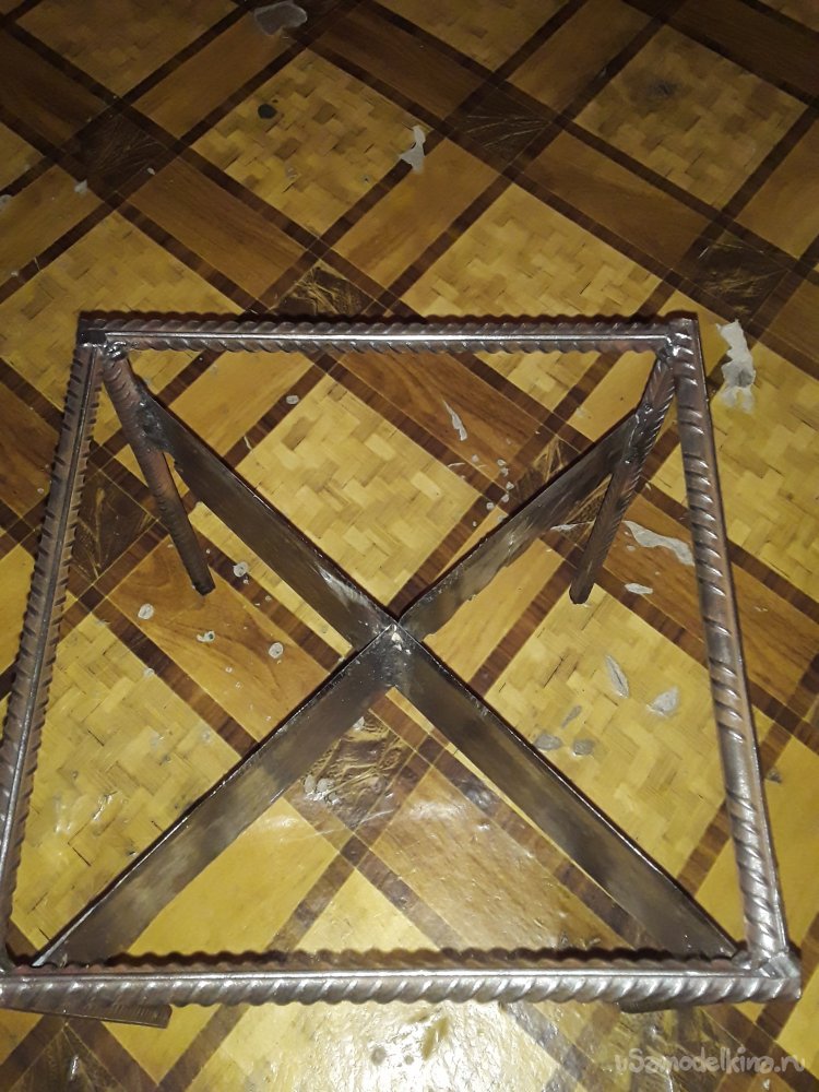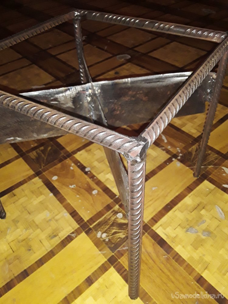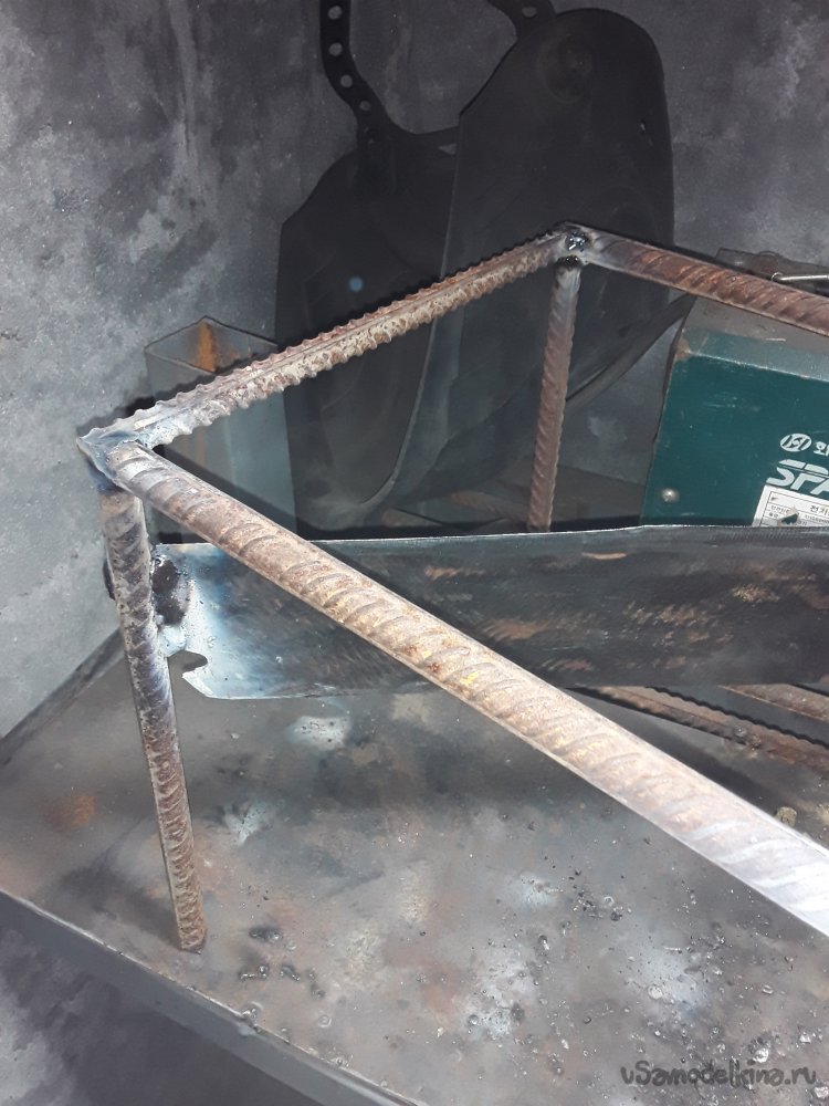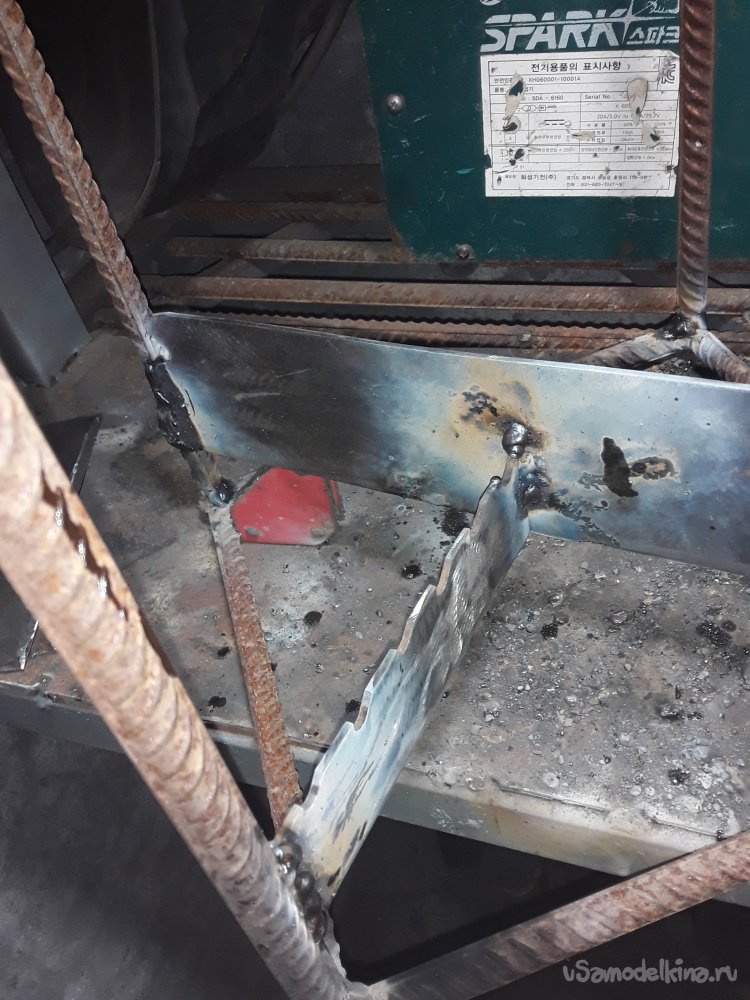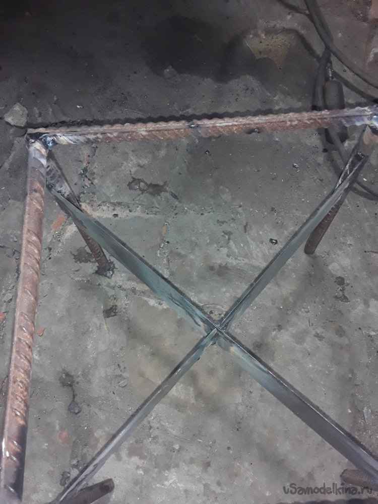 После проверки правильности углов привариваю все окончательно. Далее отбиваю весь шлак и болгаркой шлифую все швы и все места где буду приваривать ножки зачищаю и выравниваю чтобы ничего не мешало. Для ножек отрезаю по 26см 4 куска арматуры также соблюдая все углы с уголком наживляю ножки попарно. Так как у меня в кузнице пол бетонный на окончания ножки приваривать ничего не буду, так есть неровности пола и конструкция будет не устойчивой да и будет греметь при ударах. После выравнивания углов привариваю все так, чтобы все было безопасно и ничего не отвалилось. При сварке одну ножку повело и она ушла в сторону на 3мм для того чтобы выровнять в месте сварки прогреваю электродом до красна и подгибаю как нужно и пока остывало держал руками. Ну вот основной каркас готов осталось самое главное это приварить рубящее лезвие.
