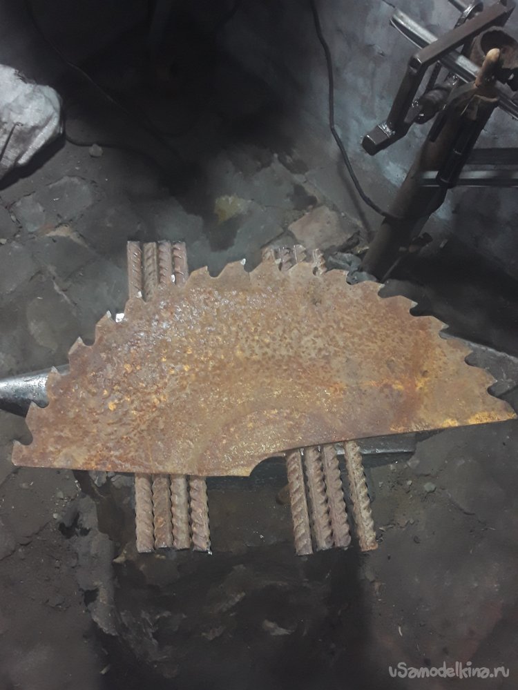 Здравствуйте уважаемые местные и гости, как всегда, появилось немного свободного времени и решил что-нибудь сделать для мастерской. Обычно я приходу в мастерскую и растапливаю горн чтобы было тепло, а щепки рублю то топором, то ножом. И решил себе собрать очень простое, но нужное приспособление для рубки щепы и небольших деревяшек. На улице на постаменте из бетона стоит большое почти такое же приспособление сделано из двух кусков трубы 400мм разрезанных на части и сварена с проставками для увеличения радиуса и арматуры 20мм и высотой 1‑м делал года 4 назад. Рубящая часть сварена из 4‑х старых сломанных топора, а почему сломаны потому что бил по обуху кувалдой так и накопились обломки. Эта штука очень массивна да и для рубки крупных чурок не раз даже рубил с сучками правда кое-как вытащил застрявшее бревно. Так что соберу облегченный вид для рубки щепы для розжига из того что найду. В мастерской нашел 2‑м арматуры 12мм и кусок от диска циркулярки 300мм думаю этого хватит. И так для меня обычно друг пилит куски по 30см они сухие и без сучков дерево вроде бы сосна. По этому особо мощно делать не буду 12мм арматура думаю сойдет. Все вроде рассказал приступать к подготовке и сборки.