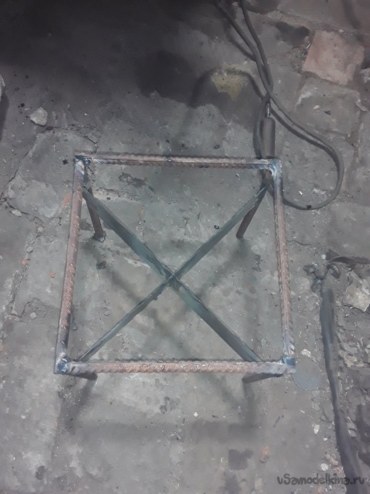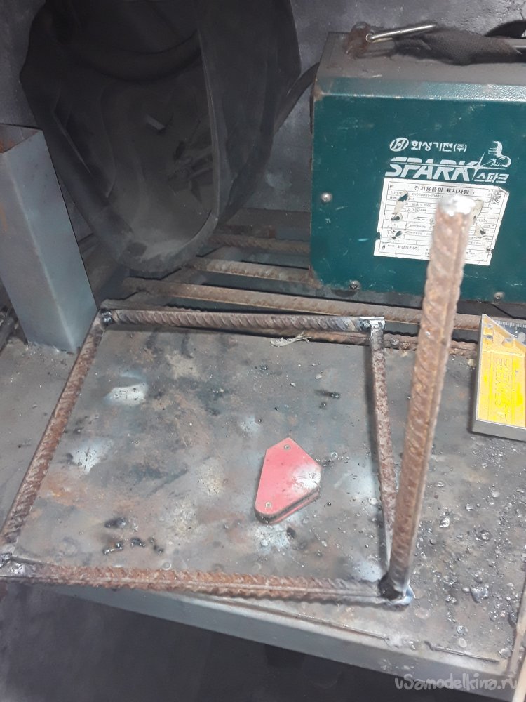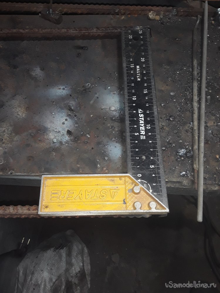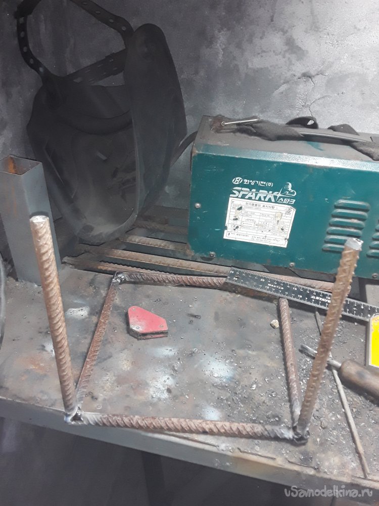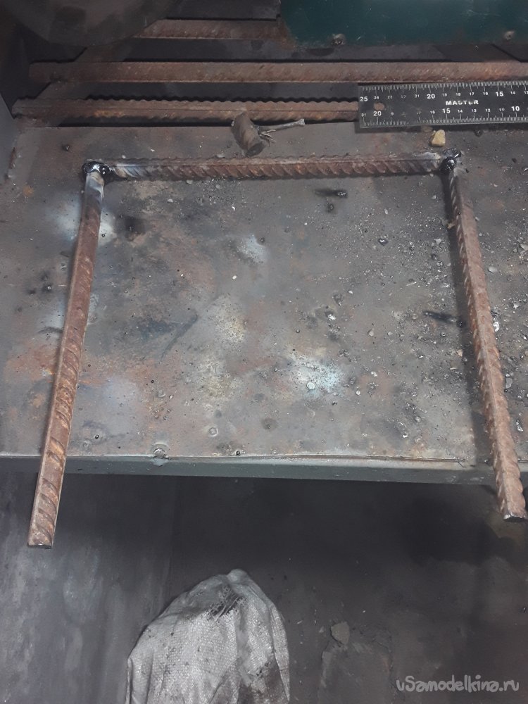 Так как у меня в основном все деревяшки по 30см и приспособление буду делать небольшого размера для ножек отрезаю 4 куска арматуры по 25см для рамы хотел отрезать кусок от 300мм трубы, но что-то побоялся у нее толщена 10мм, а болгарку недавно сделал. А согнуть в круг арматуру я не смогу так как разжечь горн нет возможности у нас ветер штормовой с порывами до 25м в секунду и по этому делаю в форме квадрата для этого отрезаю 4 куска по 26см. Для того чтобы приварить все ровно использую магнитные уголки и линейку собираю и наживляю все после осмотра привариваю окончательно.