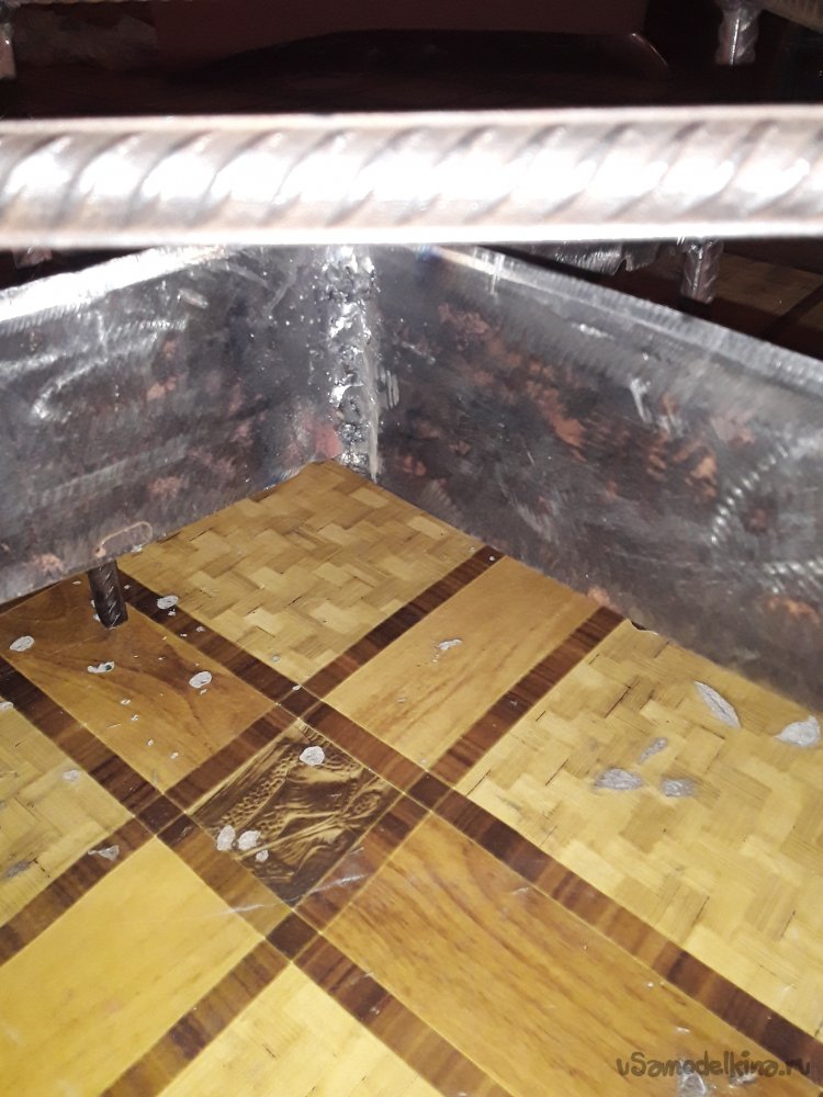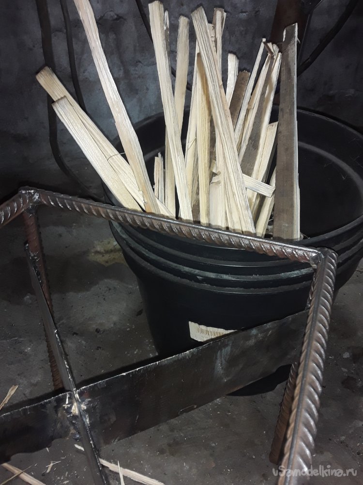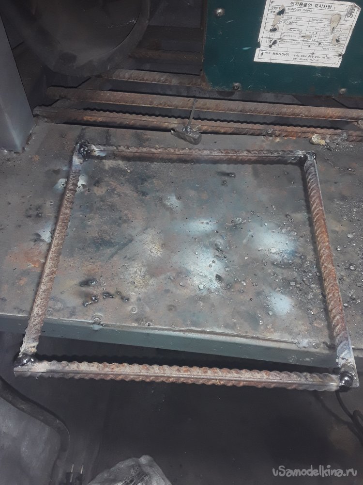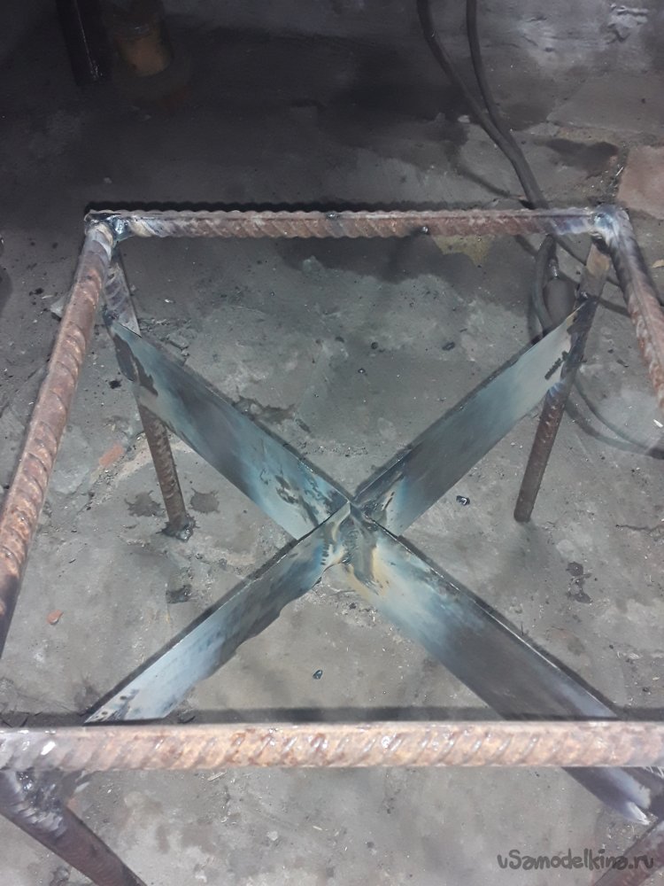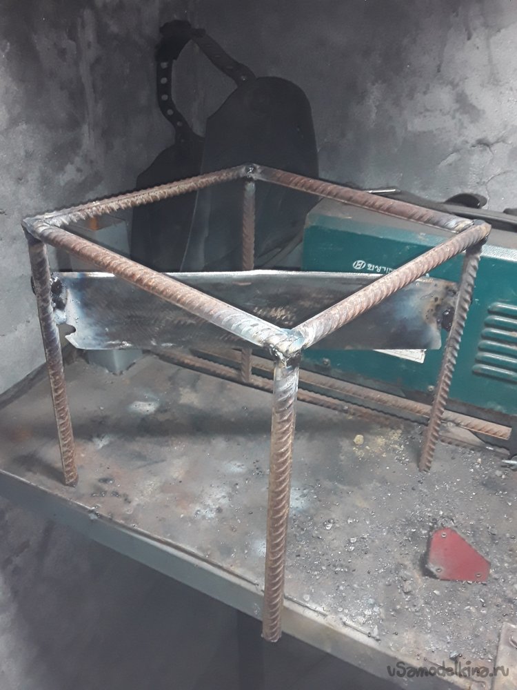 Так как у меня в основном все деревяшки по 30см и приспособление буду делать небольшого размера для ножек отрезаю 4 куска арматуры по 25см для рамы хотел отрезать кусок от 300мм трубы, но что-то побоялся у нее толщена 10мм, а болгарку недавно сделал. А согнуть в круг арматуру я не смогу так как разжечь горн нет возможности у нас ветер штормовой с порывами до 25м в секунду и по этому делаю в форме квадрата для этого отрезаю 4 куска по 26см. Для того чтобы приварить все ровно использую магнитные уголки и линейку собираю и наживляю все после осмотра привариваю окончательно.