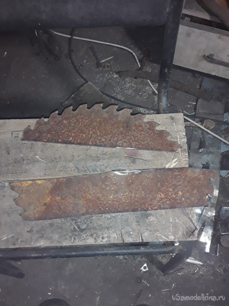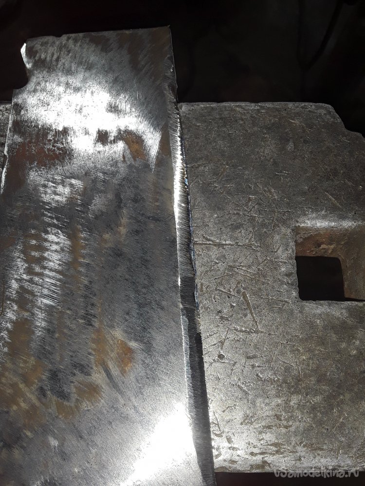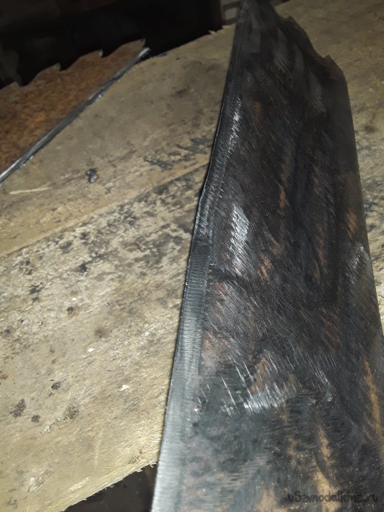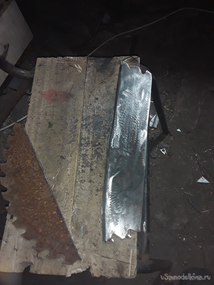 Далее выставляю полотно под угол ровно по центру и наживляю со всех сторон. Так же поступаю и с второй частью и так же по уголку наживляю проверяю и привариваю основательно. Думал приварить куски арматуры для усиления в весте где полотно приварил на ножках, но думаю все и так крепко приварено. Когда приварил то, подумал в месте, где стыкуются лезвия что металл станет мягким, но нет он такой же крепкий потом только узнал что быстрорез закаливается на воздухе, а именно металл нагревается до температуры 950гр, и остужается на воздухе такую сталь называют самозакал. А я боялся что испорчу, метал перегревом и постоянно остужал водой хотя при заточке немного подполил режущую кромку, но это не страшно это же не нож и на эстетику это не влияет.