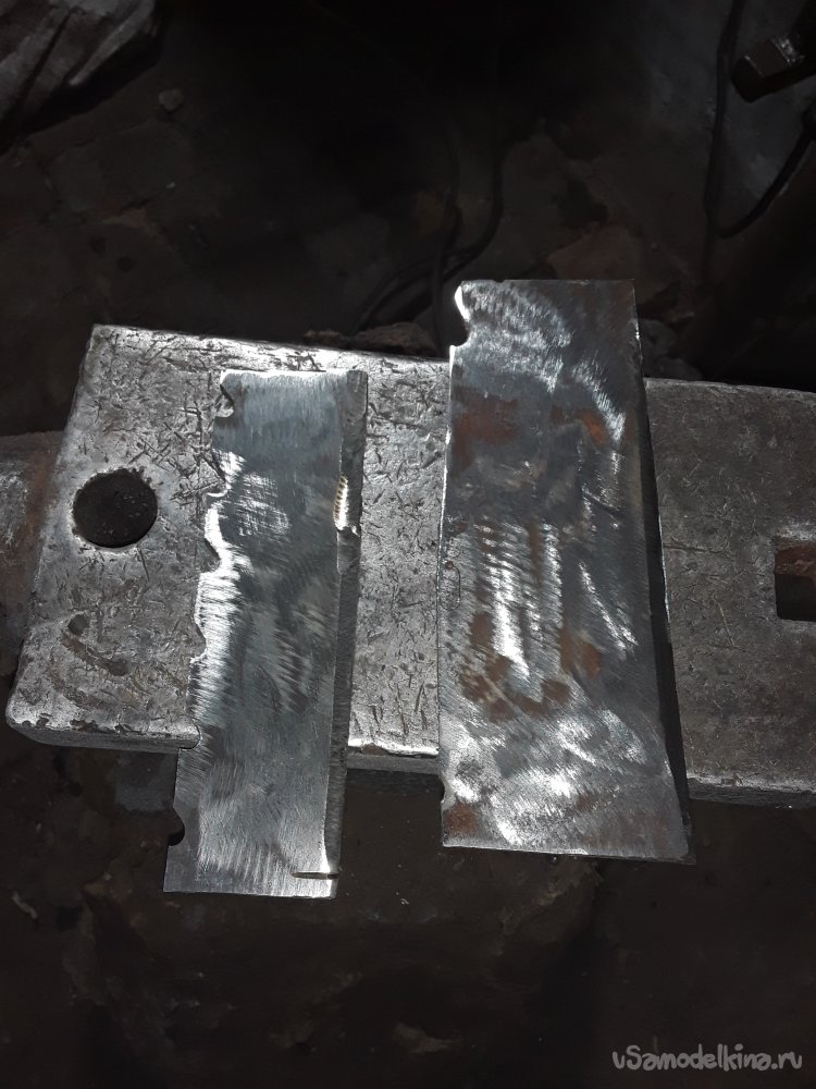 Далее мне нужно приварить еще кусок такой же длины, но у меня остался только небольшой кусок с зубьями. Изначально вообще не хотел чтобы в центре был какой-либо распил так как это место уже будет более слабое. Я хотел сделать небольшой пропил по центру полос и соединю крест на крест потом только произведу сварку. Замеряю от ножки до пластины расстояние и отрезаю под размер тут же зачищаю все болгаркой и затачиваю на наждаке. Для второго куска долго искал и нашел только узкий кусок от полотна мех.Пилы так же его подгоняю под размеры и зачищаю и затачиваю под 45гр.