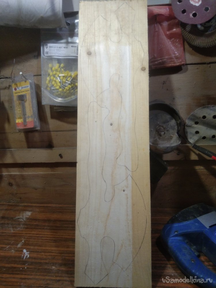 Следующий шаг - нанести контур изделия по шаблону на заготовку. Мне в этом помогают канцелярские кнопки, которыми я прижимаю трафареты к древесине. Далее спокойно обвожу, не боясь смещения шаблона. Так же и здесь. На одной заготовке, доске, я разместил два изделия, которые нужно сделать. Затем электролобзиком с полотном для фигурного реза приступаю к выпиливанию заготовок будущих секир. После этого необходимо сделать более плавными полукруглые углубления находящиеся у основания лезвия. Лобзиком их сделать таковыми очень не просто из-за небольшого радиуса. Поэтому для этих целей я использовал гравировальную машинку, или дремель как ее иногда называют, с насадками из наждачной бумаги. С ее помощью выравнивается все очень легко и просто!