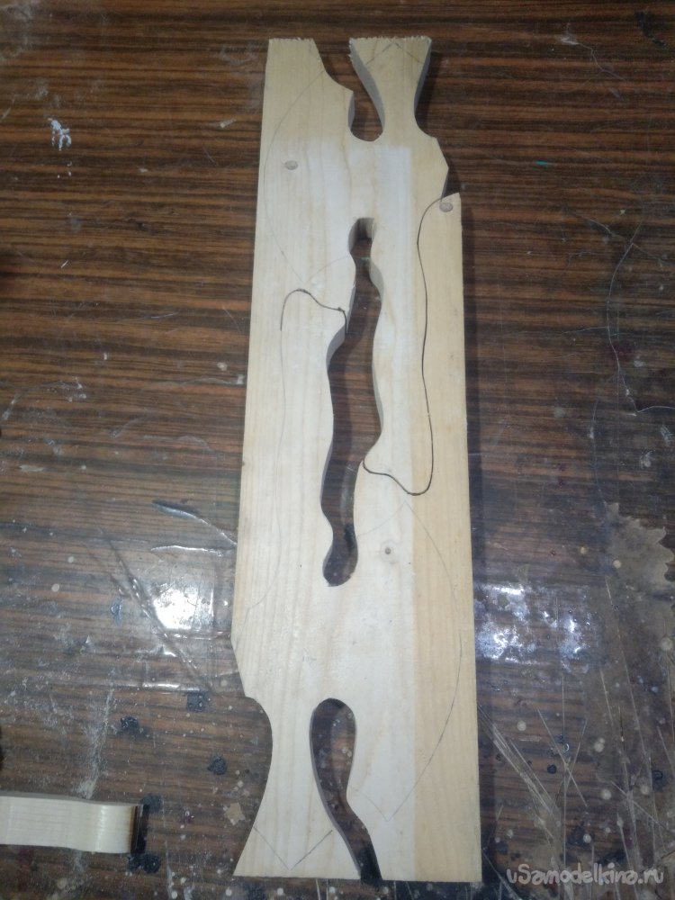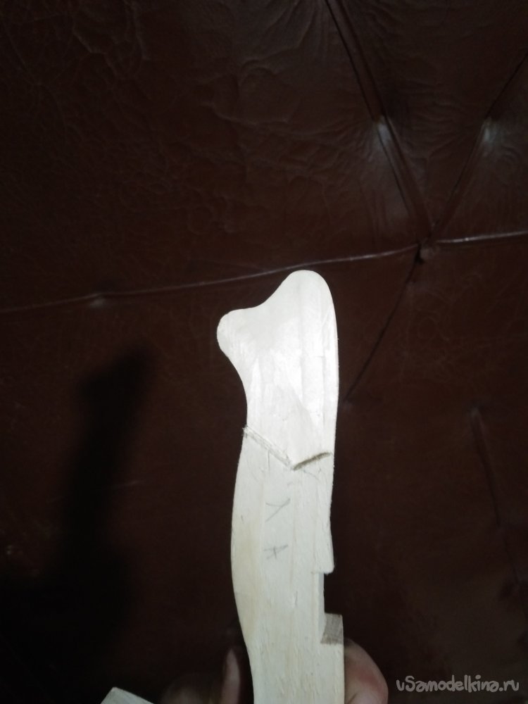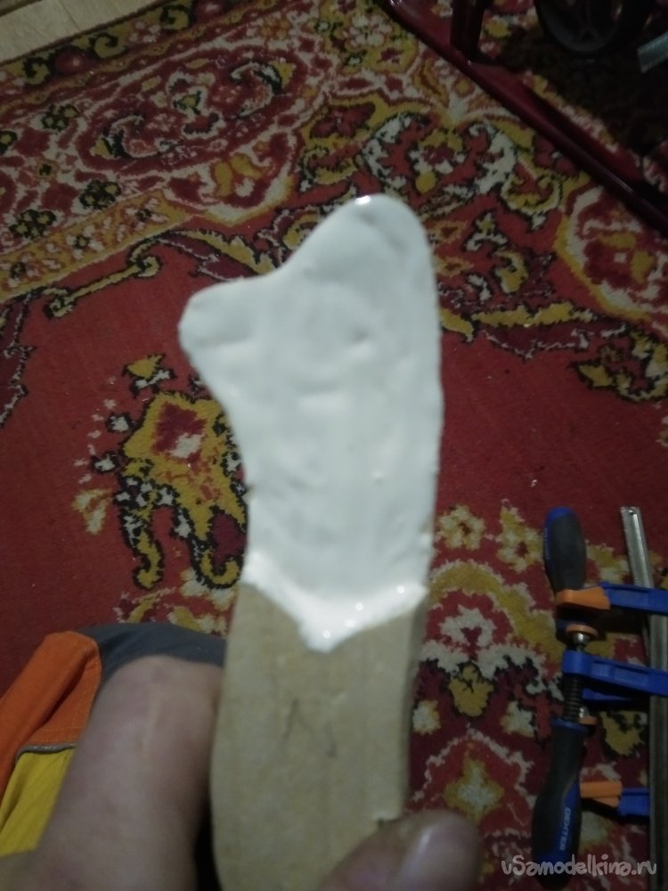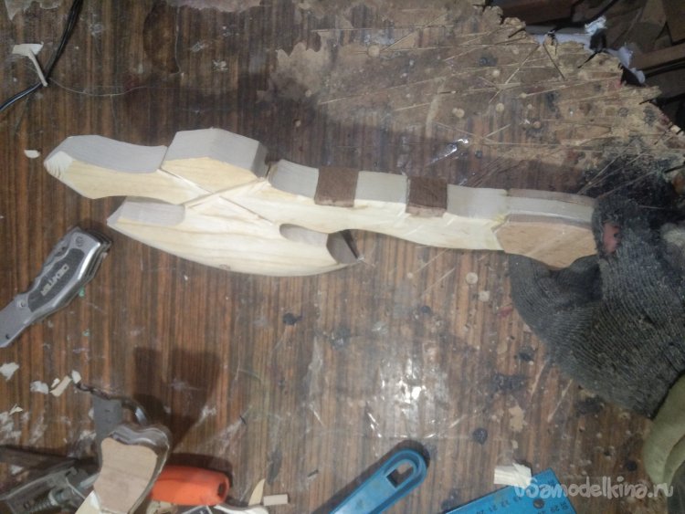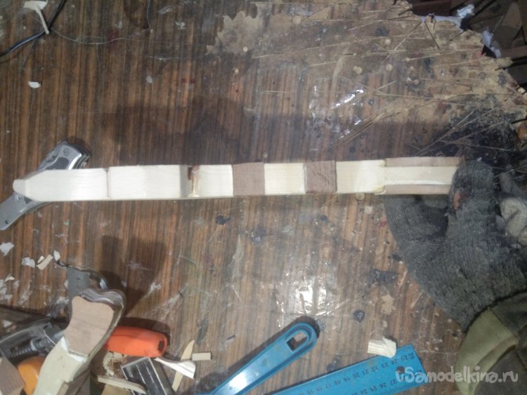 Из буковых реек вырезал накладки. По можно делать не точно по размеру, а немного больше. Так удобнее, да и все равно позже они будут обтачиваться вместе с рукоятью. Нанес в пазы клей и с помощью струбцин прижал склеиваемые детали. Для верности выждал сутки и приступил к следующей части работ.