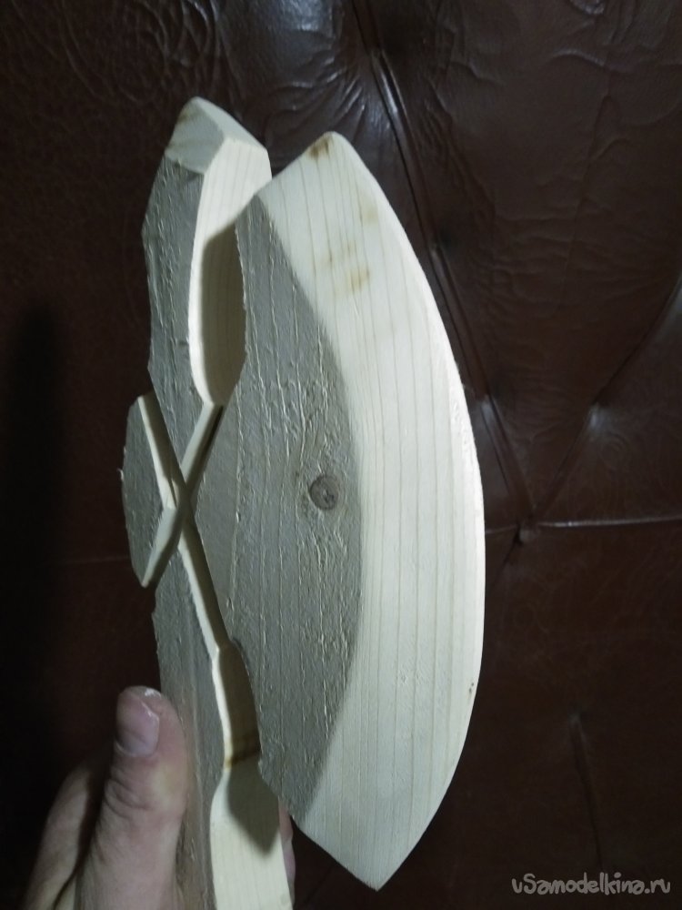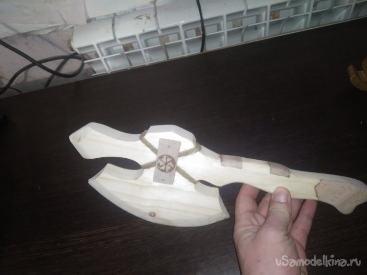Болгаркой с установленным на ней лепестковым диском с большой зернистостью убрал с заготовок все лишнее. Придал изделиям форму, близкую к тем, которые бы я хотел видеть. Накладки сровнял с основными частями изделий. Затем шлифмашинкой прошелся по всем плоскостям, убирая неровности которые остались после грубой шлифовки. Затем уже вручную убирал все задиры и неровности, делая изделия гладкими, чтобы не осталось каких-либо заноз и дети не могли занозить рученки. Обмотал обухи шпагатом. Чтобы конец постоянно не вылетал из заглублений, просверлил небольшое отверстие и вставил в него, предварительно капнув немного супер-клея. После полной обмотки другой конец так же зафиксировал клеем. Затем на нескольких буковых плашках выжег знак "Громовик" и закрепил его на перекрестье шпагата. Посадил на клей и закрепил несколькими гвоздиками с каждой стороны.