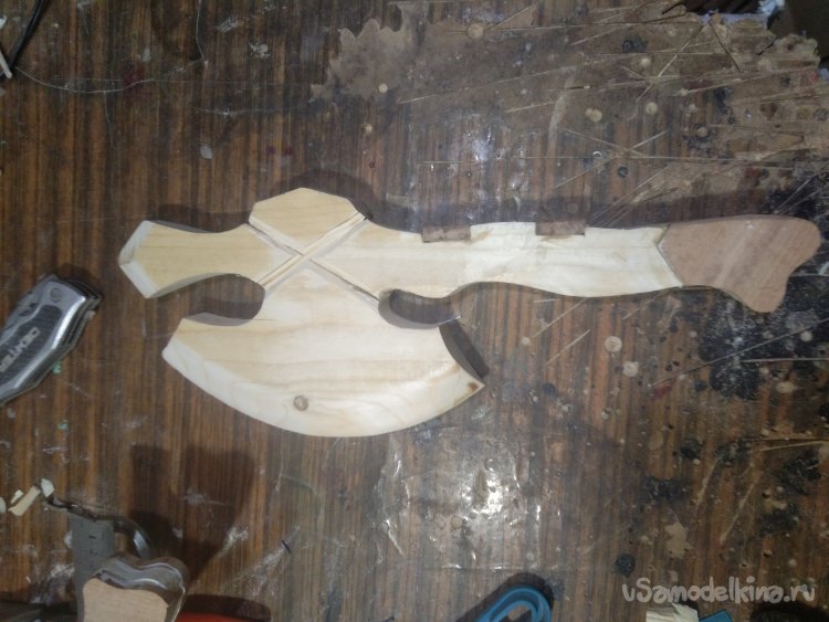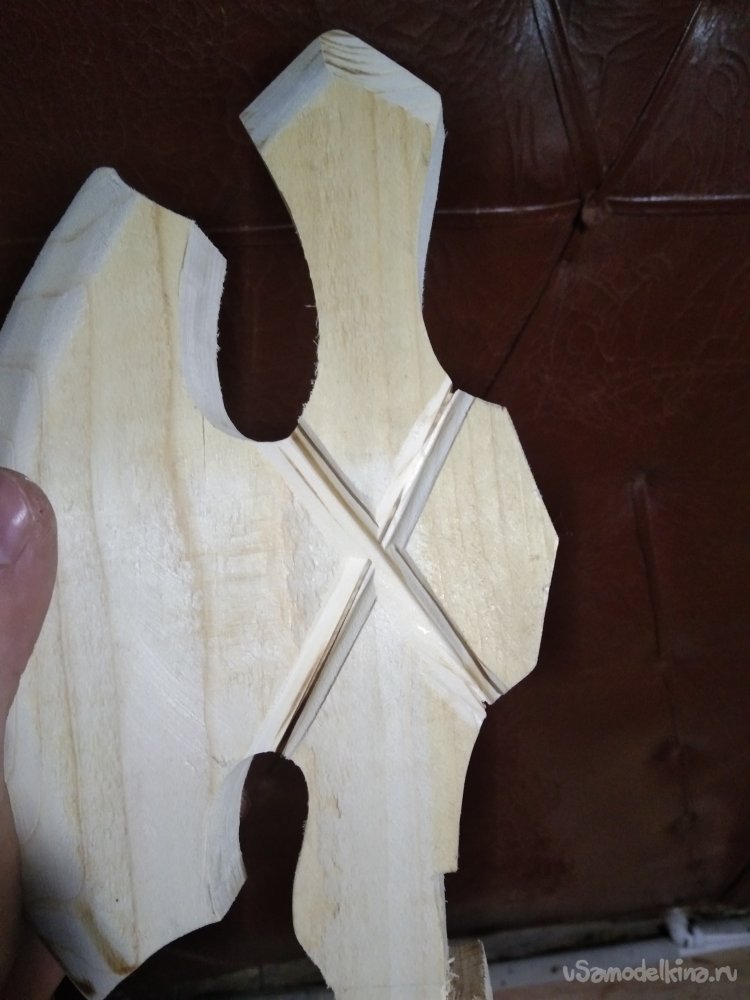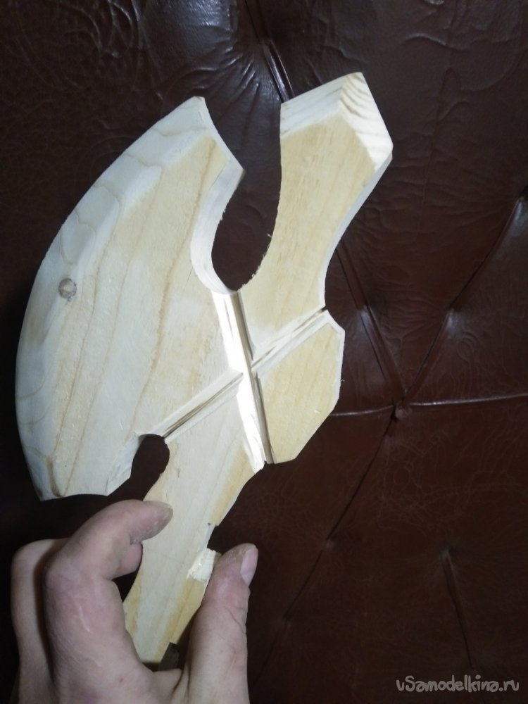 Так как красить готовые изделия я не собирался, то внешний вид получался у секир довольно-таки скучный и унылый. Поэтому уже в процессе работ было принято решение немного улучшить секиры, придать им немножко индивидуальности. Это я решил сделать с помощью накладок из бука на нижних частях рукоятей и их спинках. Темная древесина будет выгодно оттенять светлую и весь общий вид изделий будет смотреться намного интереснее. Сделал разметку на нужных местах и полотном по металлу выпилил неглубокие прорези. Затем молотком и стамеской убрал все лишнее, чтобы получились неглубокие пазы. На обухе с двух сторон сделал крестообразные углубления, чтобы в последствии намотать туда шпагат для украшения. Так он не будет сползать и останется на своем месте. Для этого была использована УШМ и обрезным диском. Ей сделал канавки, потом канцелярским ножом их немного расширил. Так же стесал немного режущую кромку у топоров.