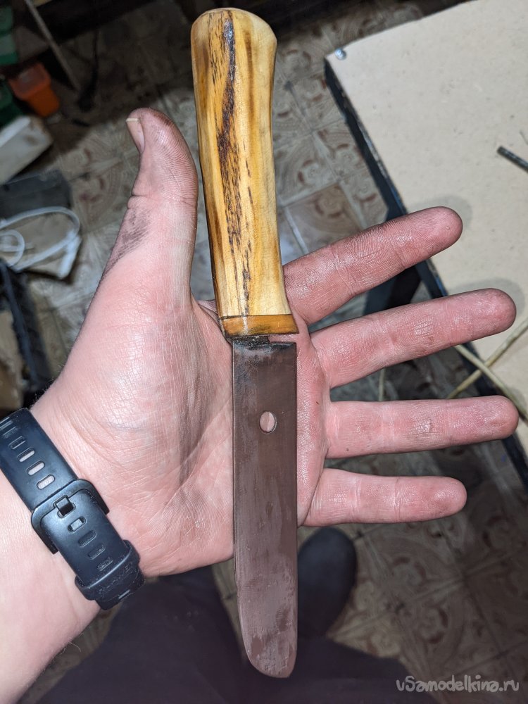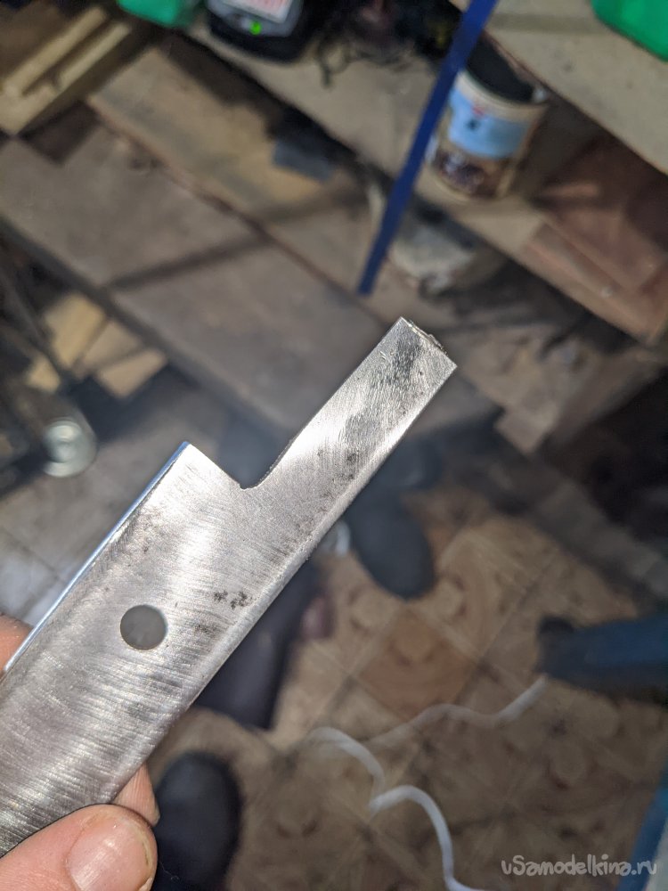 Её фото не сохранилось, но тут все просто вырезаем из железки ножеобразную форму и шлифуем до приемлемого результата, также можно произвести черновую заточку.