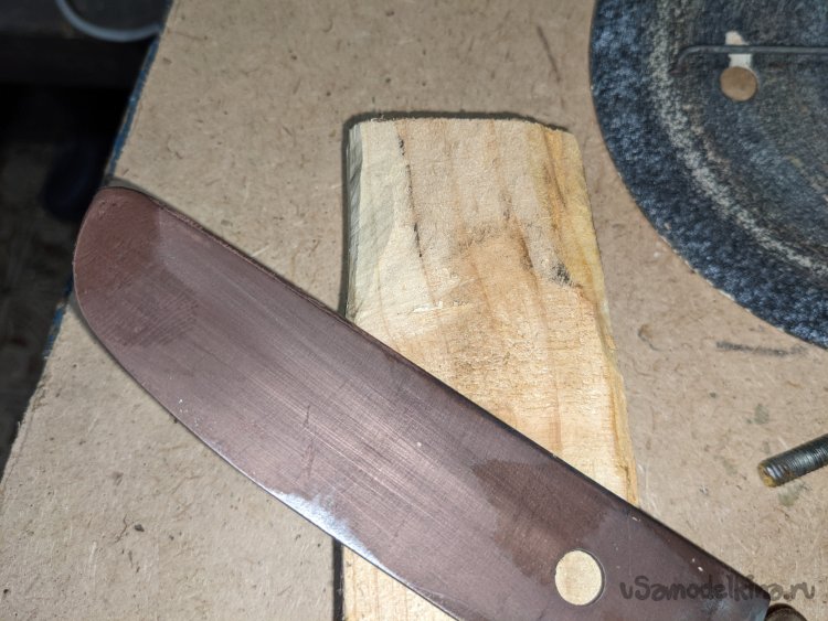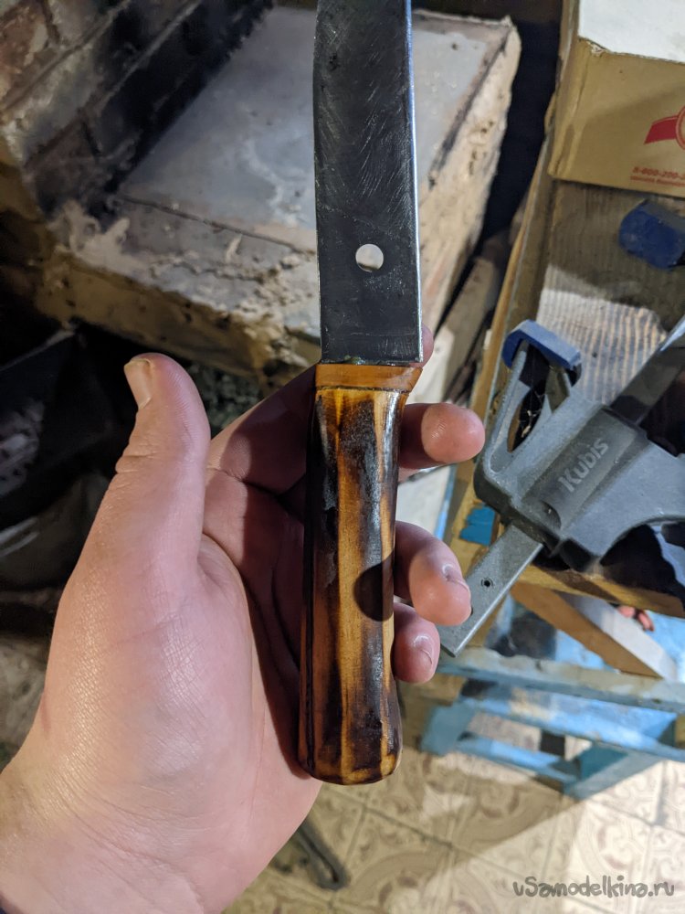 Часть из сосны обжигаем, и покрываем рукоять маслом.
