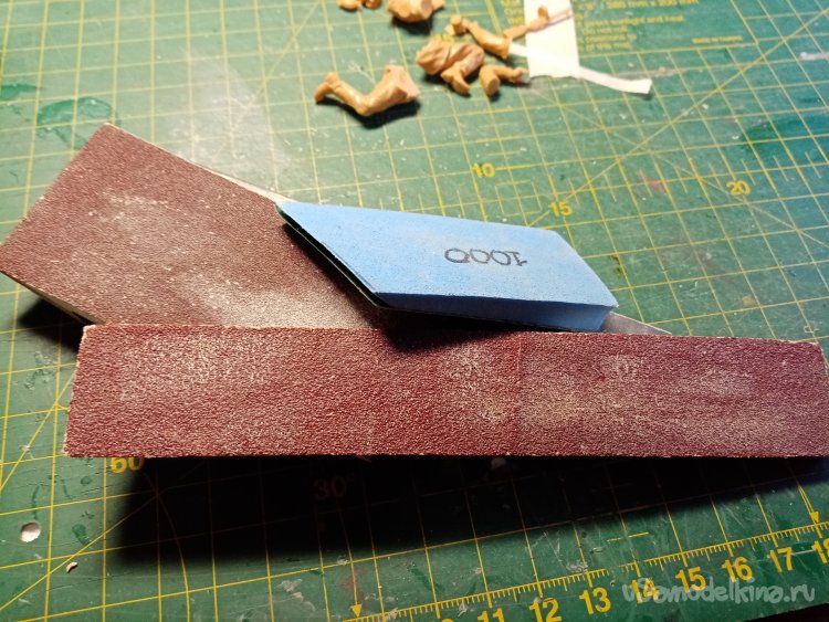 Подгоняю соединение ног с туловищем достаточно крупной шкуркой. В некоторых случаях для проверки качества работы пользуюсь лупой с подсветкой.