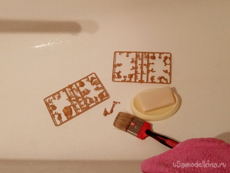 Первое дело все литники нужно промыть в горячей воде с нейтральным моющим средством. Например, с «фери» или с хозяйственным мылом. Нужно смыть грязь и возможные жирные пятна. В противном случае плохо будет приставать акриловая краска. Не смотря на то, что в её состав входят спирты.