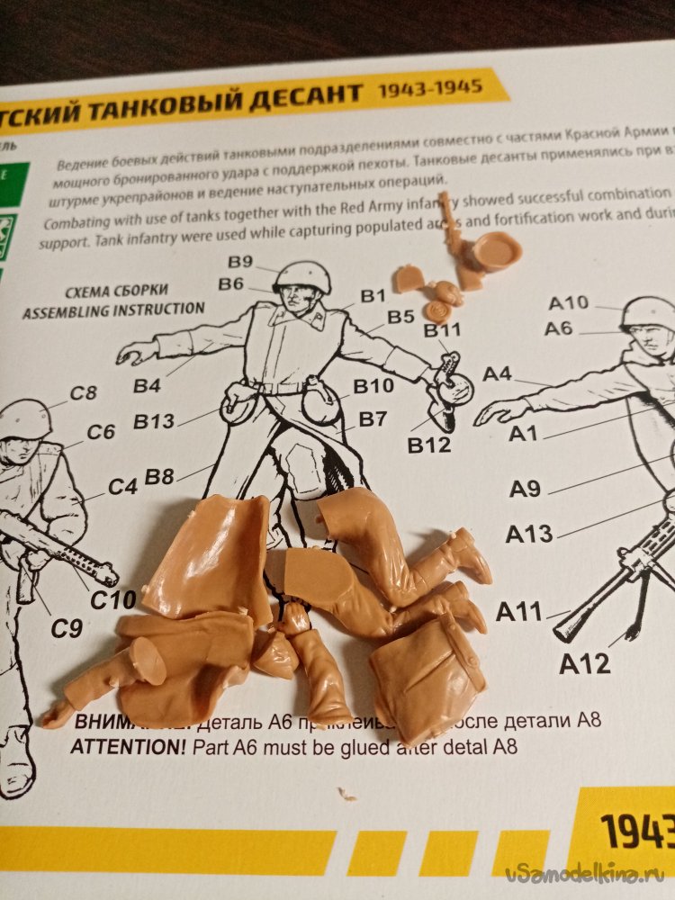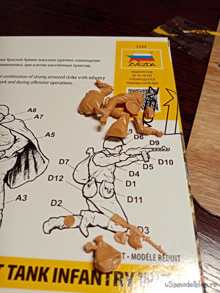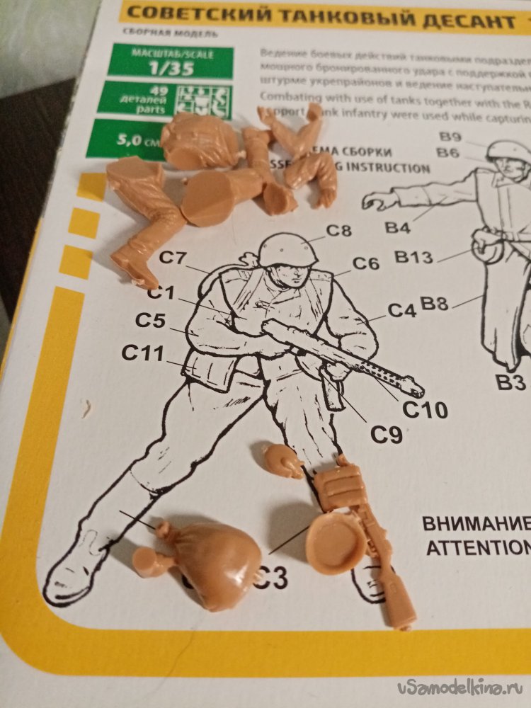 Инструкции по сборке в виде дополнительного листочка нет. Весь порядок нарисован на коробке. Начинаю сбору воина с автоматом, присевшего на колено. Осторожно отделяю детали от рамки литника. В этой операции использую нож для творчества с треугольным лезвием. Перемычки лучше резать подальше от детали. Поскольку возможен скол пластика. Раскладываю по порядку, детали самого солдатика и его экипировку «обвес».