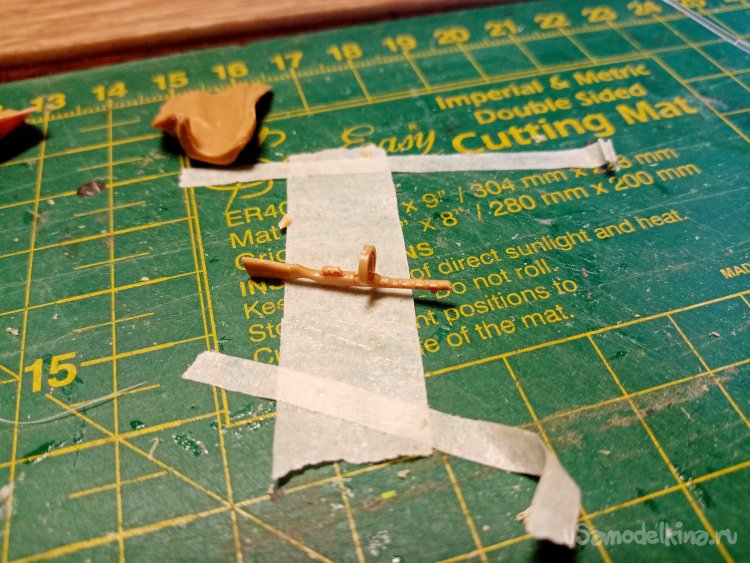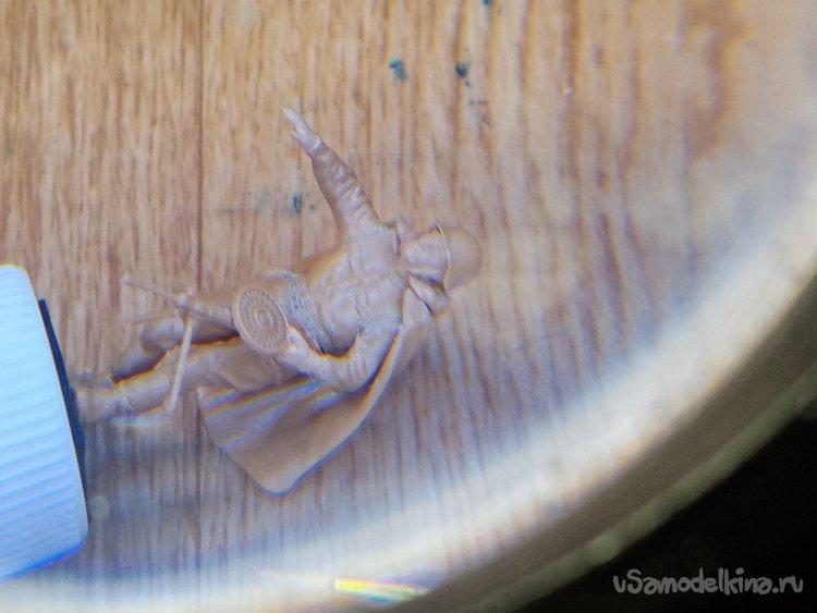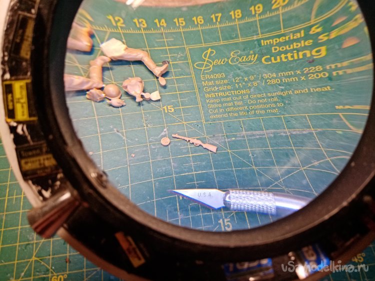Под увеличительным стеклом с подсветкой осторожно удаляю остатки литников и облой от следов смыкания формы. Особая осторожность в обращении с оружием. Оно отлито довольно хорошо. Но все элементы в таком маленьком масштабе довольно тонкие. И отрезать лишнее или сломать «как два пальца обосфальт». Все заусенцы и прочие неровности удалены при помощи обыкновенного ножа для творчества с треугольным лезвием.