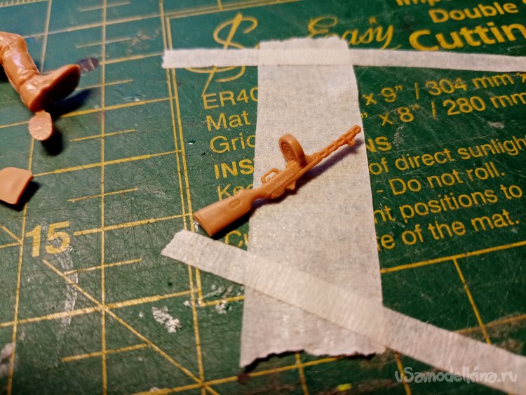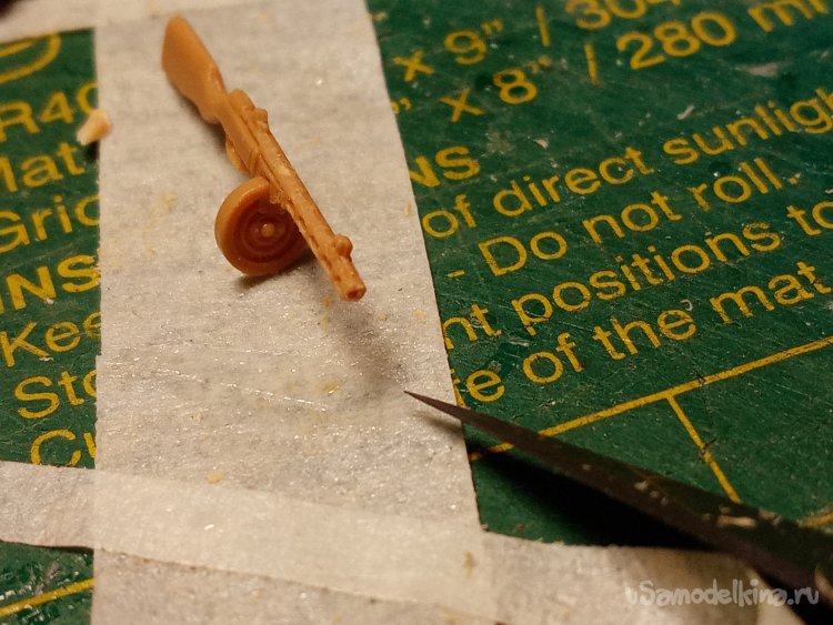 Первым делом собираю автомат. Приклеиваю диск с патронами. Осторожно освобождаю от облоя, его совсем немного. Автомат отлит хорошо.