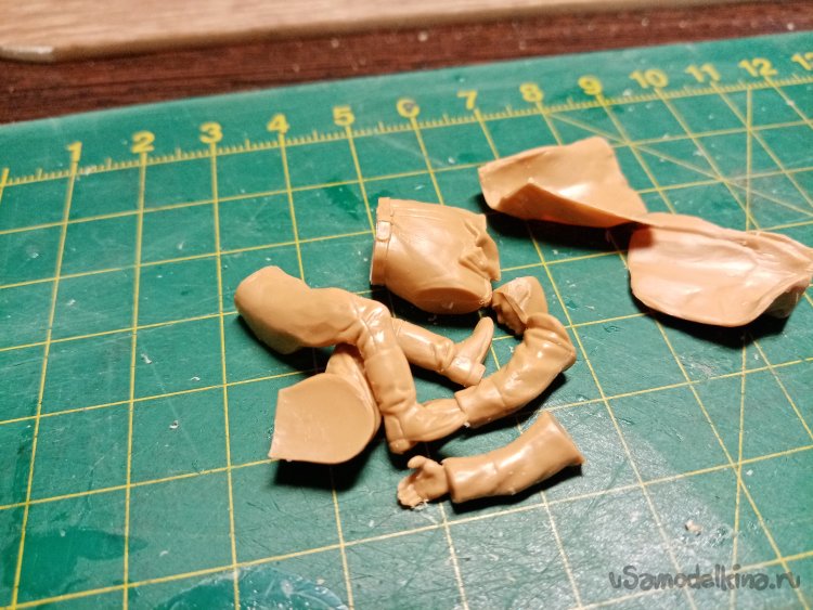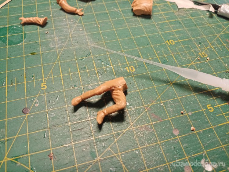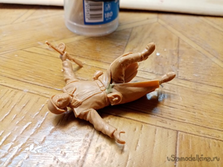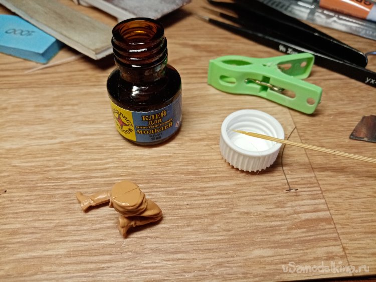 И так продолжаю работу над фигурками. Подогнал соединение ног при помощи шкурки. Важнее не зашлифовывать пластик до блеска. Применяю немного шкурку номер 400. Остаются после нее небольшие царапины, которые хорошо принимают клей для пластика. При помощи бамбуковой лучины наношу клей, немного выжидаю и соединяю детали. Пластик по шву начинает слегка плавится. Если соединение не точное, можно немного подвигать детали, чтобы расплавленный пластик немного раздавился и даже вылез валиком из шва. Это хорошо, детали соединились точно, без щелей. Остатки пластика потом срежу ножом. Не нужно будет шпаклевать.