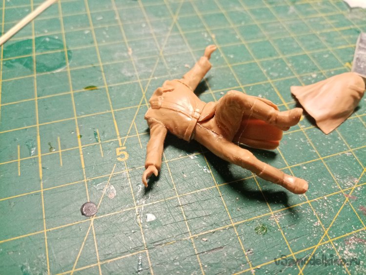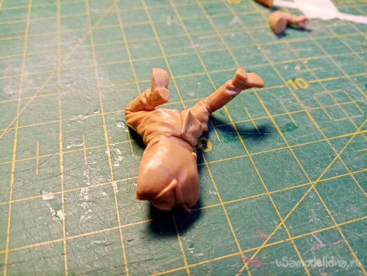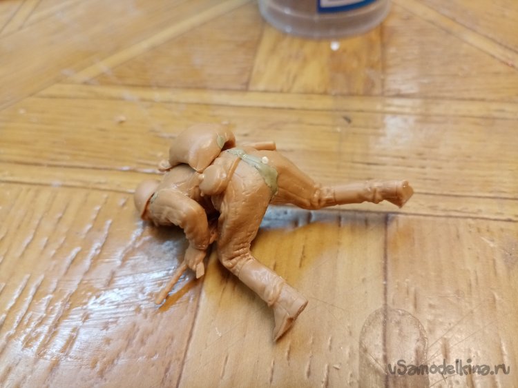 Приставляю туловище к ногам. Досада не посмотрел. Ноги немного разошлись в самом интересном месте. Но клей еще не затвердел полностью. Сжимаю ноги для устранения дефекта.