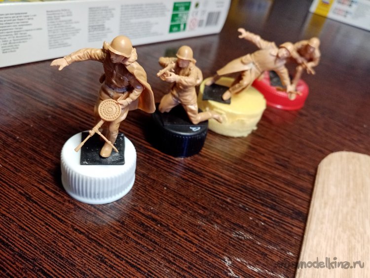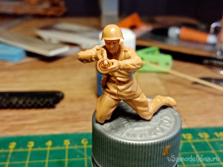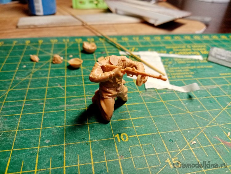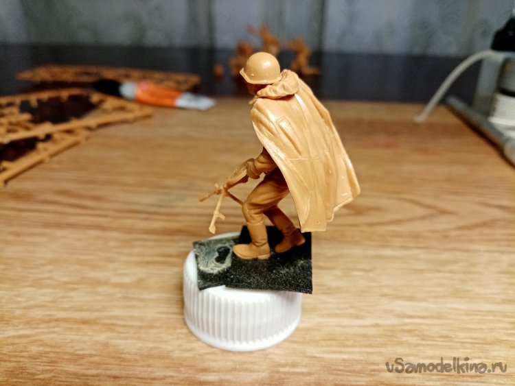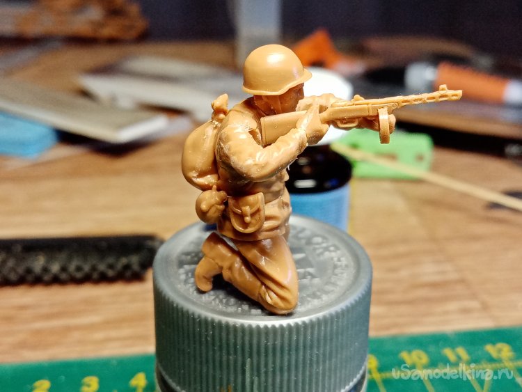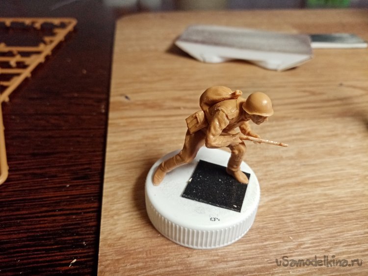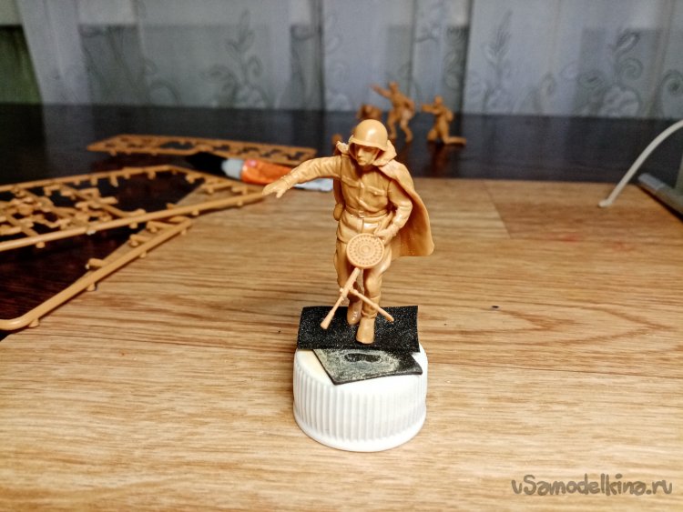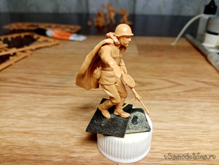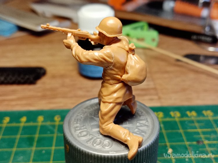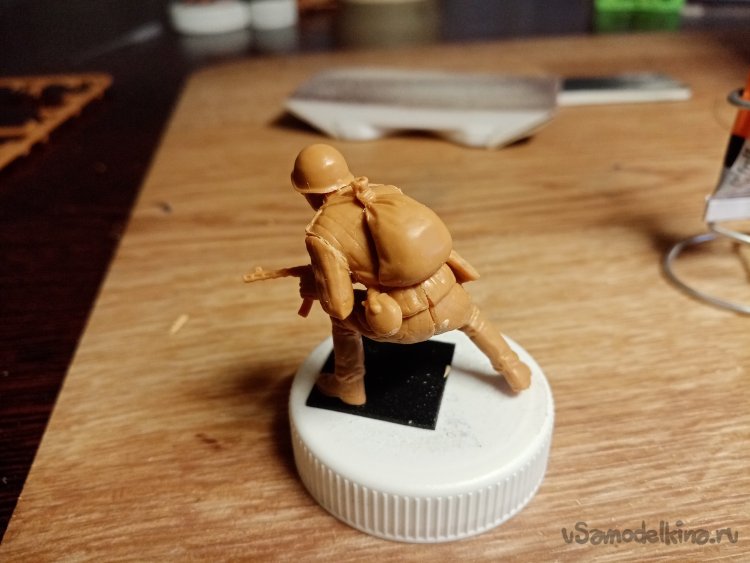 Еще один автоматчик, в телогрейке и стеганых штанах. Автомат ППД кажется. Из обвеса есть, сумка для рожков, фляга, «сидор». Отделяю детали от литников. Начинаю зачищать облой.