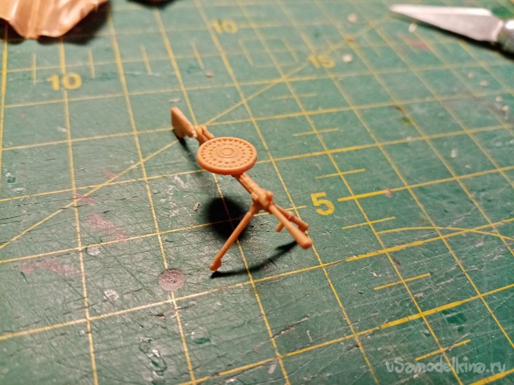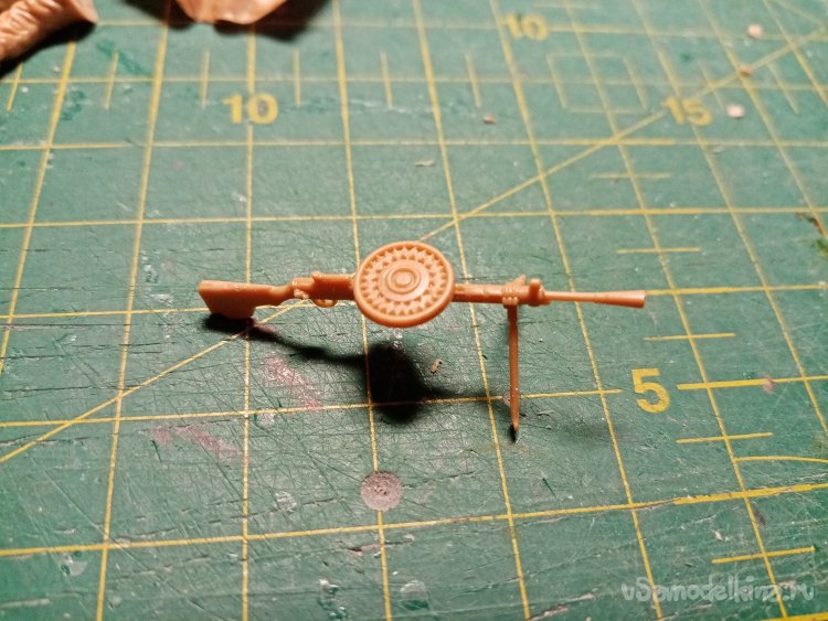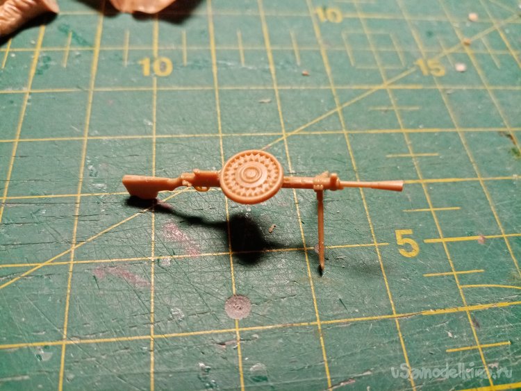 Первым делом собираю пулемет. Вверху диск, внизу сошки. Детали отлиты качественно. Видно даже курок.