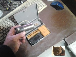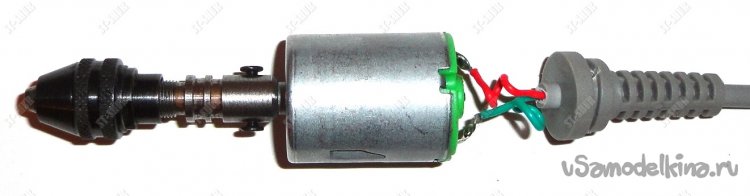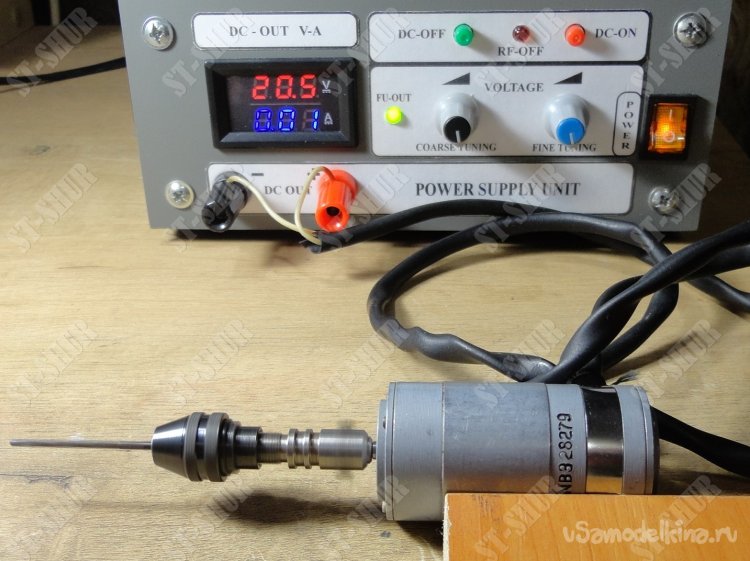 В ходе эксперимента решил опробовать «крутилку» от маникюрного набора. Который был приобретён за «смешную» цену (в скупке), в основном ради симпатичного корпуса регулируемого БП (0-12В 1А) и его комплектации. Так же в комплекте был достаточно удобный алюминиевый корпус с электромотором диаметром 24мм, и диаметром вала 2мм. В данном корпусе было просверлено отверстие для отвертки, что обеспечило удобство при установке конструкции с патроном.
