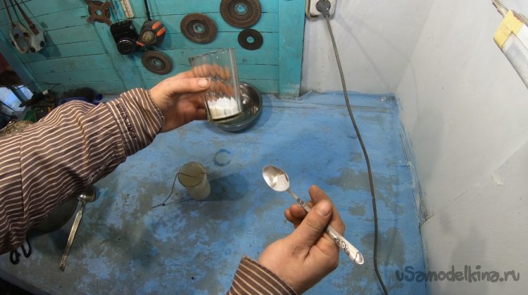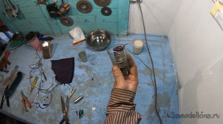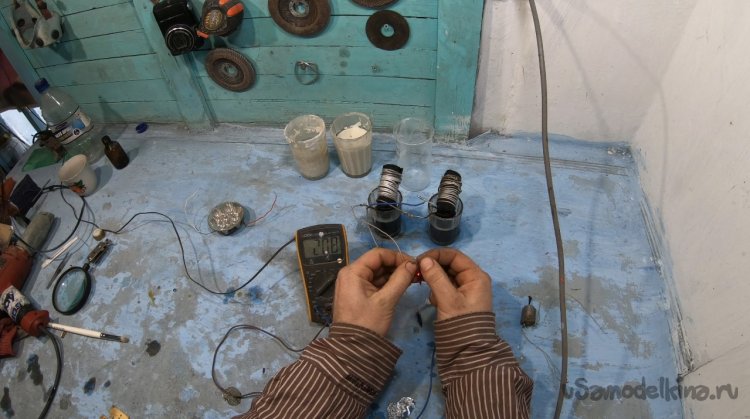 Батарейки помещаем в рюмки, медные контакты лудим, для предотвращения гальванических реакций.