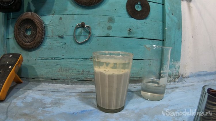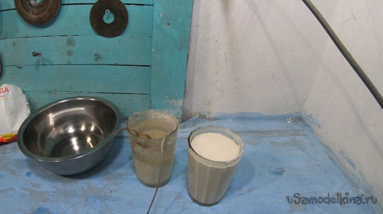 Первым делом нам понадобится стакан, насыпаем в него около 4 чайных ложек соды, далее можно налить известковое молоко примерно половину стакана. Все тщательно перемешиваем и ставшуюся половину стакана заливаем горячей водой. Стакан лучше оставить в тепле, чтобы температура была хотя бы 30 градусов.