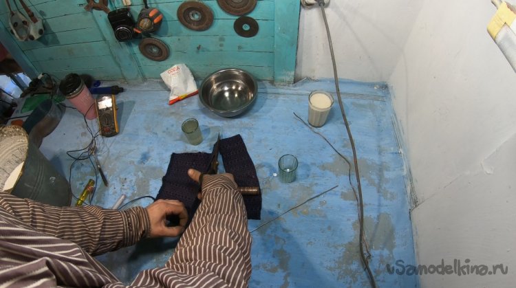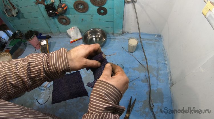 Вырезаем кусок тряпки и обматываем сердечник, это будет диэлектрик. Бумагу или натуральную ткань лучше не использовать, поскольку она растворится в щелочи. У меня это синтетика, которая хорошо пропускает жидкость.